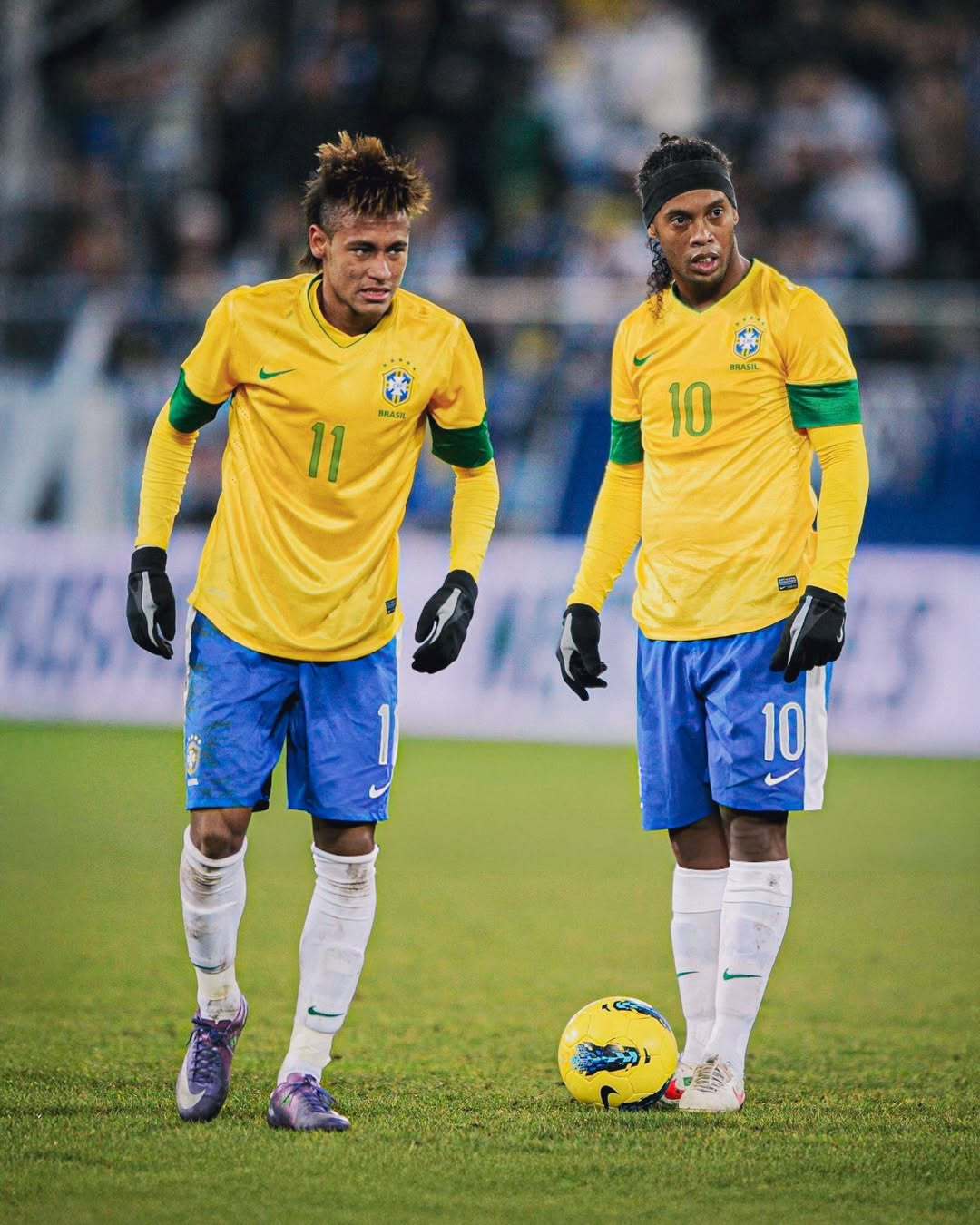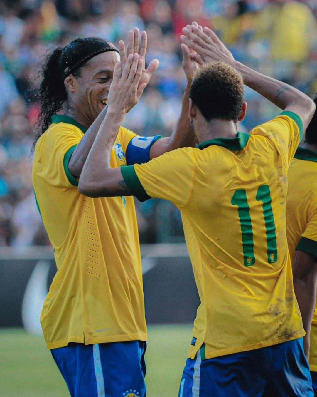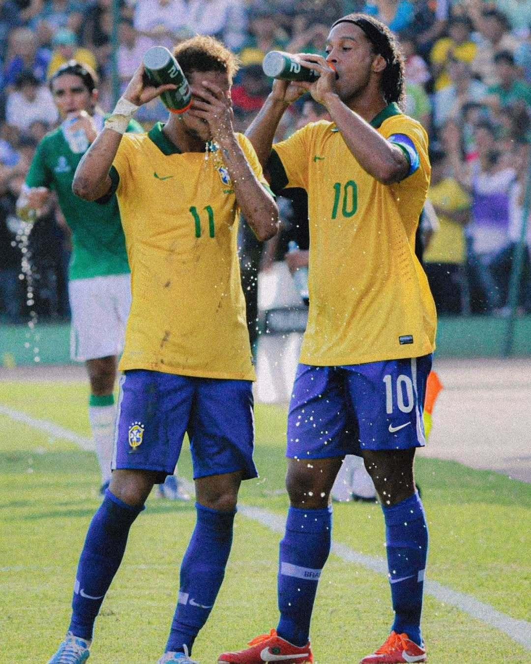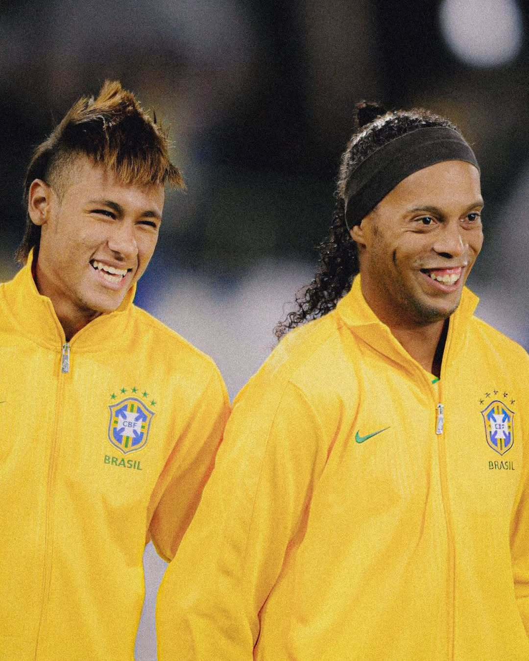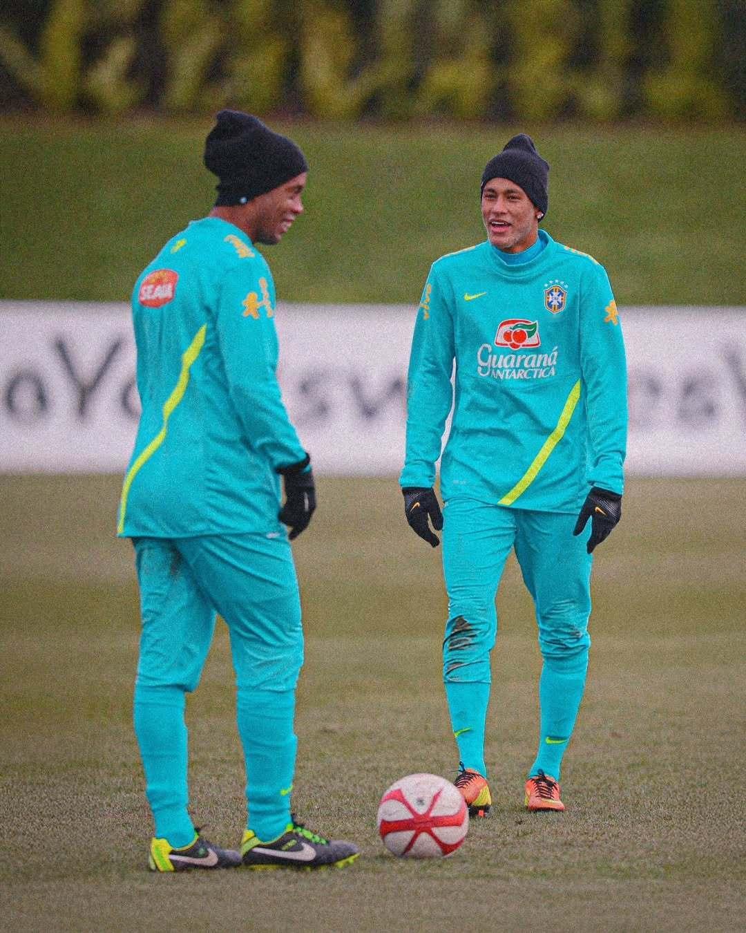 2013年左右,年少的内马尔与临近退役的罗纳尔迪尼奥同框。传奇的火炬就此传递——一个时代渐落,另一个时代正启。🇧🇷✨足球
