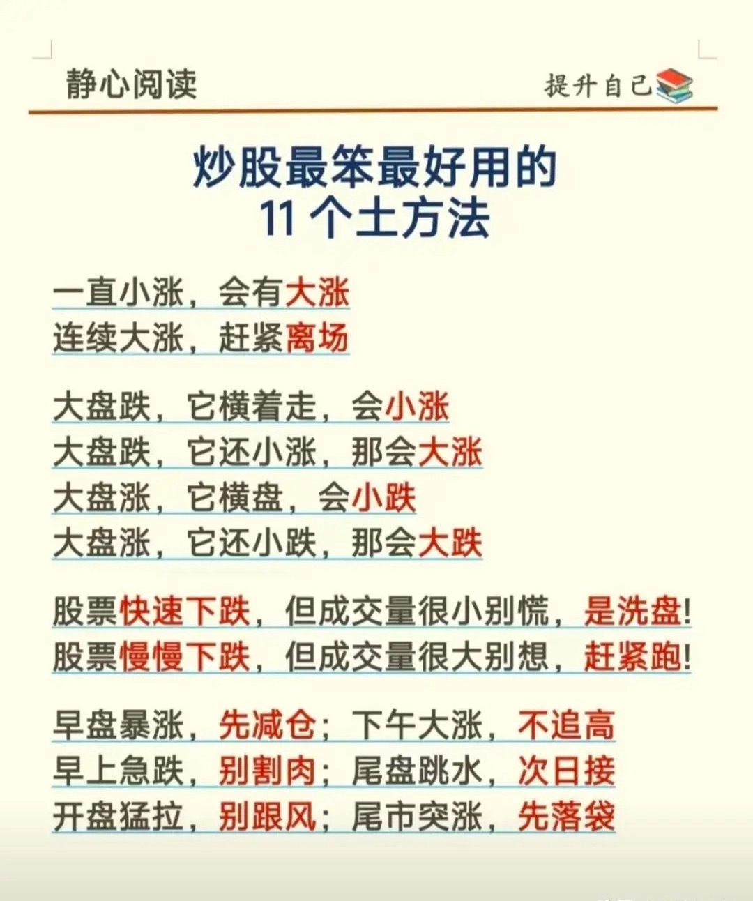 炒股最笨最好用的11个土方法一直小涨,会有大涨连续大涨,赶紧离场大盘跌,它横着走,会小涨大盘跌,它还小涨,那会大涨大盘涨,它横盘,会小跌大盘涨,它还小跌,那会大跌股票快速下跌,但成交量很小别慌,是洗盘!股票慢慢下跌,但成交量很大别想,赶紧跑!早盘暴涨,先减仓:下午大涨,不追高早上急跌,别割肉:尾盘跳水,次日接开盘猛拉,别跟风;尾市突涨,先落袋