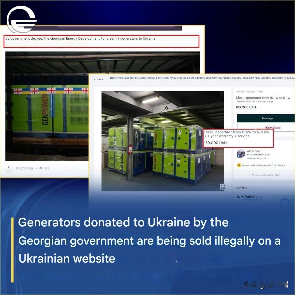 格鲁吉亚政府捐赠给乌克兰的九台发电机被发现在乌克兰网站 OLX 上非法出售。 2025 年 10 月 31 日,格鲁吉亚政府批准了一项法令,由格鲁吉亚能源发展基金购买价值 150 万格鲁吉亚拉里(超过 50 万美元)的各类发电机,作为人道主义援助无偿捐赠给乌克兰。 非法销售: 图像显示,其中一台标有 "GENPOWER" 的发电机出现在乌克兰的在线市场 OLX.ua 上出售,标价为 180,000 乌克兰格里夫纳。 影响: 这一事件引发了人们对乌克兰援助物资处理不当和腐败的担忧,社交媒体上的评论指出,这些本应帮助普通民众的捐赠最终可能被转售给富人。