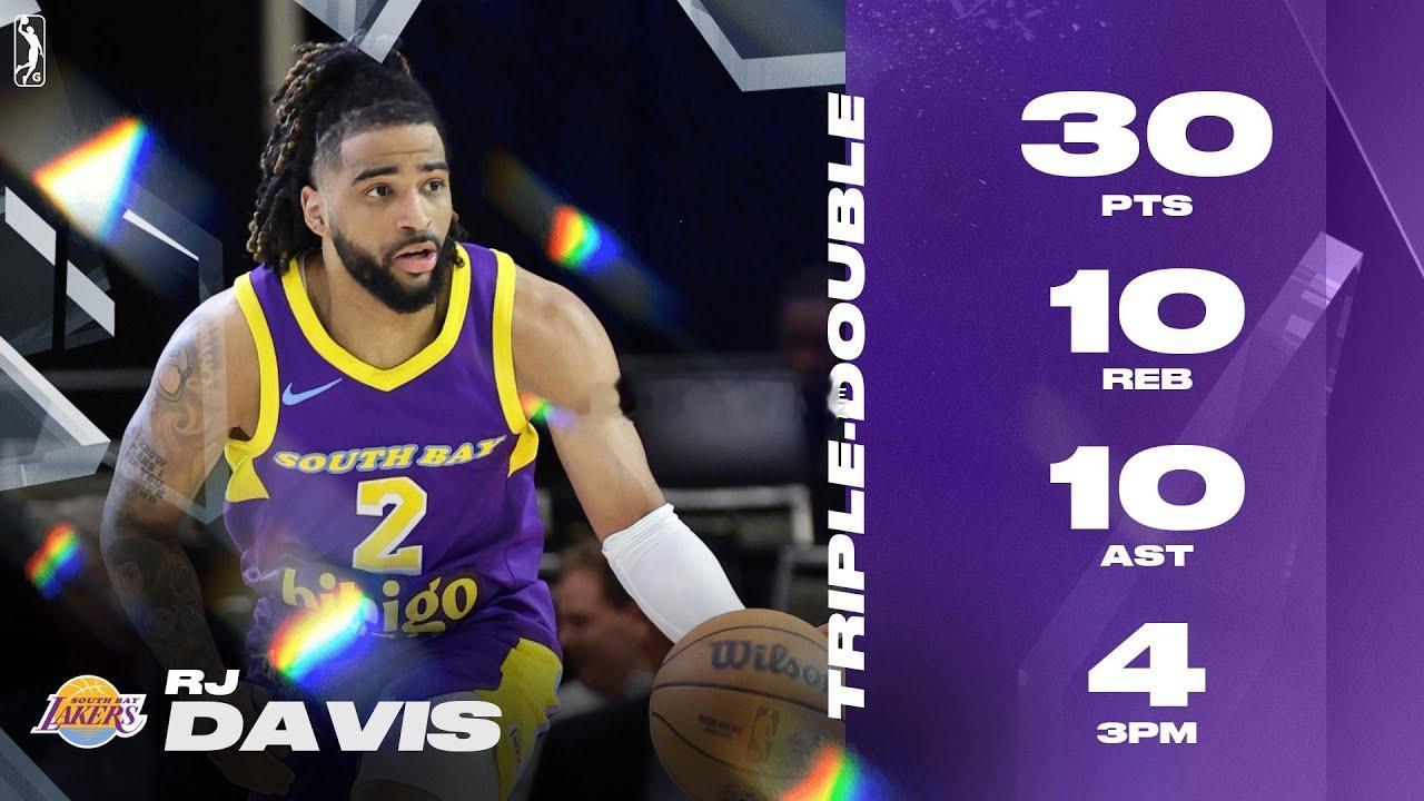 湖人二队南湾湖人的先发控卫RJ-戴维斯面对爵士二队盐湖城星出场34分钟,投篮22中11,三分线外7中4,罚球2中2,得到了全场最高分30分外加10篮板10助攻1抢断1盖帽的三双数据,还有4次失误和2次犯规,正负值也是达到了+24。