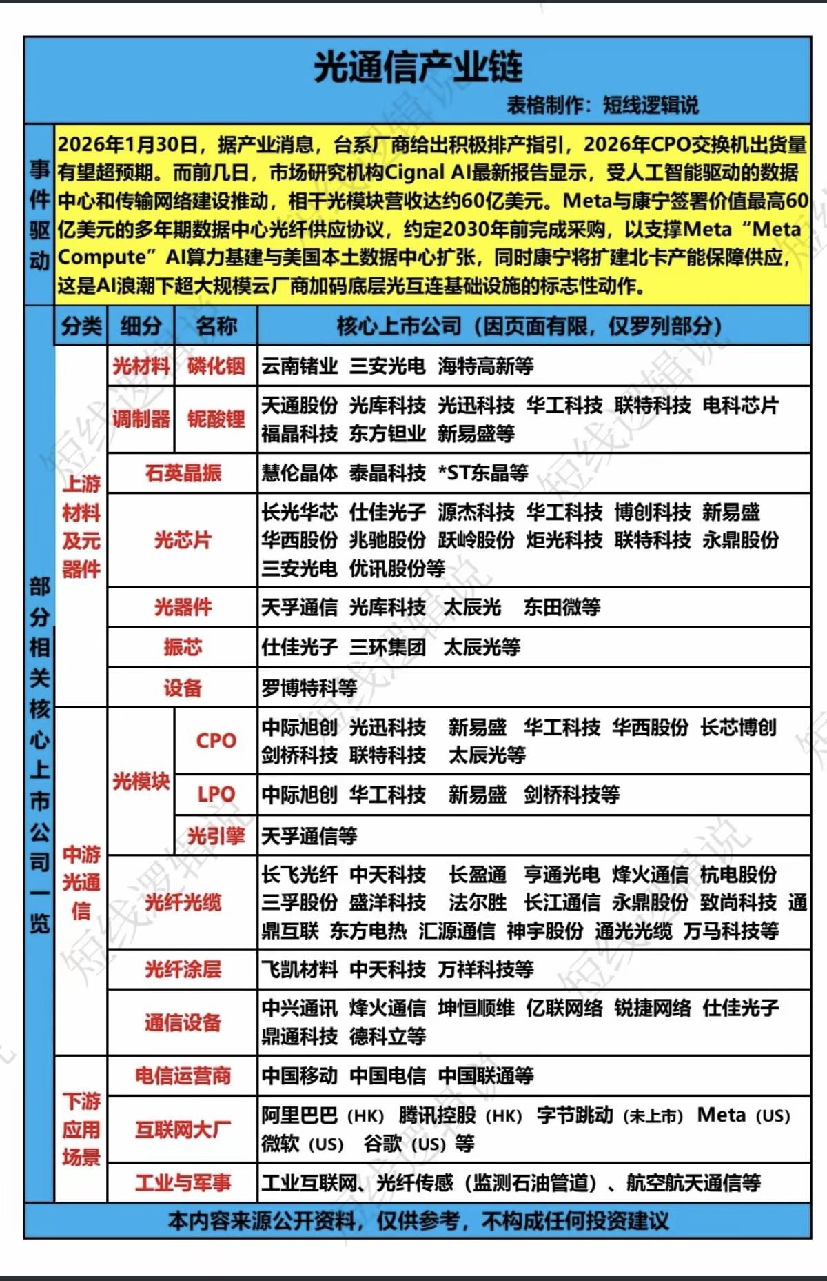 光通信产业链:核心梳理! 周五CPO光通信概念逆势大涨! 据产业链平台消息,2026年光通信CPO交换机出货量将有望超出预期。 相关核心龙头股整理: