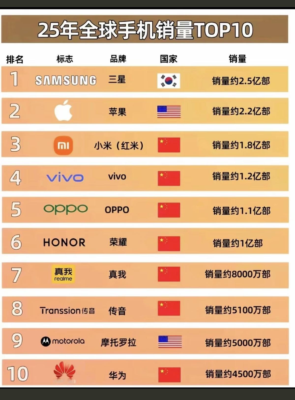 2025年度:全球手机销量TOP10 全球前10名单中,有7家都是中国产,太牛了吧! 小米第3名,华为排名仅仅第10名?!