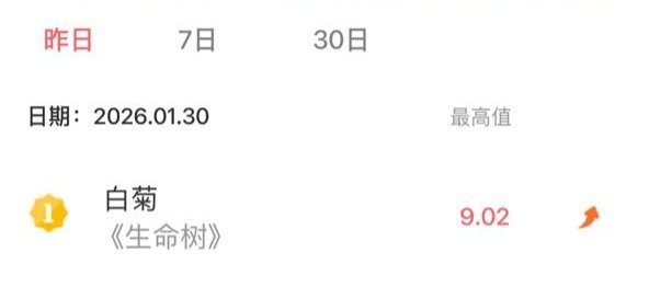 喜报📢:生命树杨紫白菊开播首日V榜角色指数破9登顶9.02