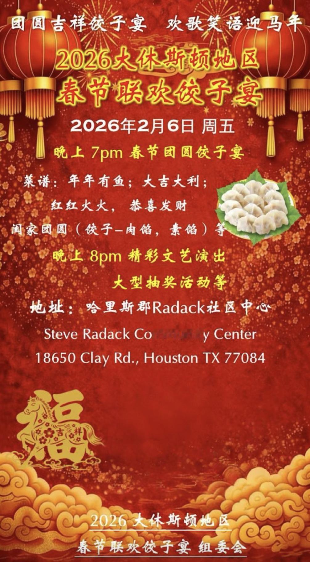 美国🇺🇸2026大休斯顿地区春节饺子宴 拳拳赤子心 以侨为桥 团圆饺子香,歌舞迎马年——新春盛宴,就差你一个! 2026年2月6日(周五)晚7点,我们不见不散! ▸ 19:00 暖心开宴|亲手包饺子、品年味,一口咬出团圆吉祥 ▸ 春节特供吉祥菜谱:年年有鱼,龙马精神,大吉大利,红红火火,四季发财,百财聚福,吉祥如意, 阖家团圆(荤素饺子)等……道道寓意美满,荤素皆备! ▸ 20:00 好戏登场|,文艺演出轮番上阵,歌舞、曲艺嗨翻全场, 更有大型抽奖惊喜不断,好运说不定就砸中你! 地点:Steve Radack Community Center (18650 Clay Rd, Houston, TX 77084) 温馨场地,年味十足,与老乡邻里共度一个热闹欢腾的中国年! 这个马年,让我们以饺传情、以歌会友、以奖添彩 ——共创一份温暖的团圆记忆! 主办:大休斯顿地区2026春节联欢饺子宴组委会