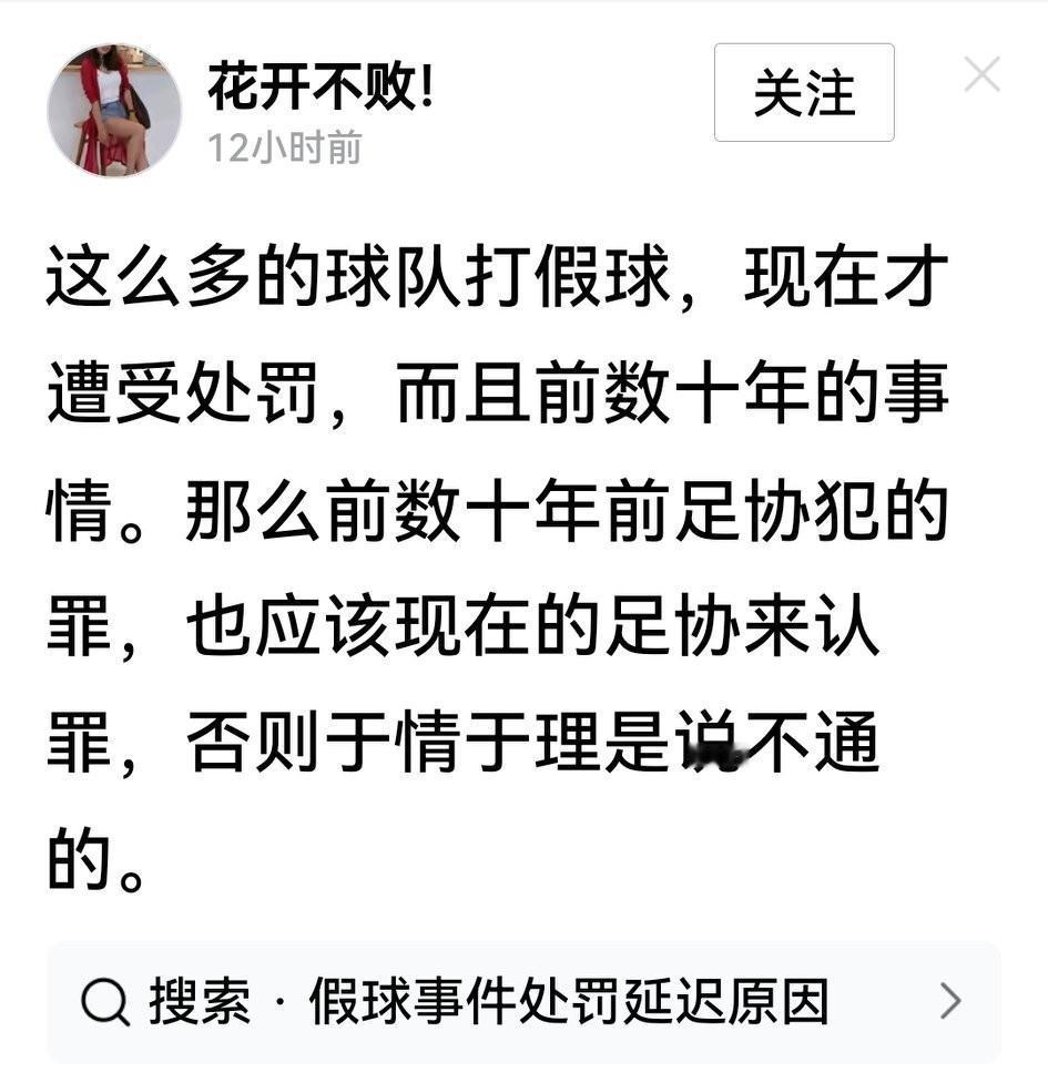 有球迷说,“数十年”前打假球现在才遭受处罚,那过去足协(的人)犯的罪现在的足协(的人)来“认罪”。 乍一看,这话除了时间扯太远、对机构不对人的表述有问题外,这球迷说的还有些道理,人家用的是同一逻辑。 毕竟,集体打假球,足协难免责;处罚的事拖这么久,办事态度和效率有问题。至少,足协该向全社会表示歉意。