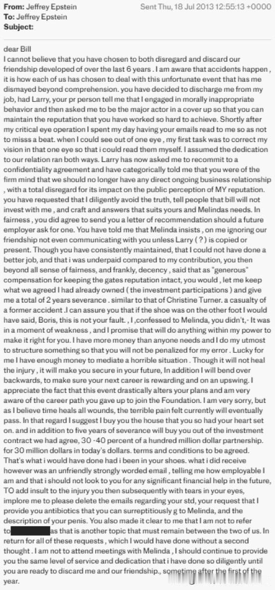 美国司法部最新公布的文件称,杰弗里·爱泼斯坦声称比尔·盖茨在与“俄罗斯女孩”发生性关系后感染了性病,并要求获得抗生素秘密给他的妻子服用。 盖茨否认了这些指控,称其为虚假和诽谤。 来源:《每日电讯报》
