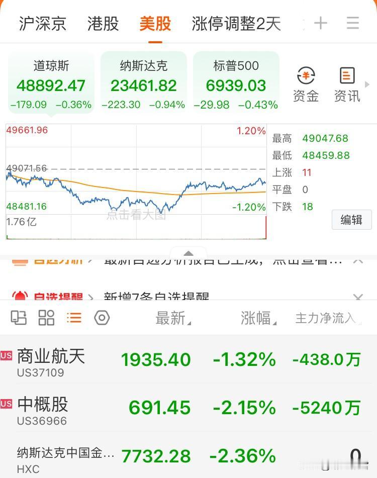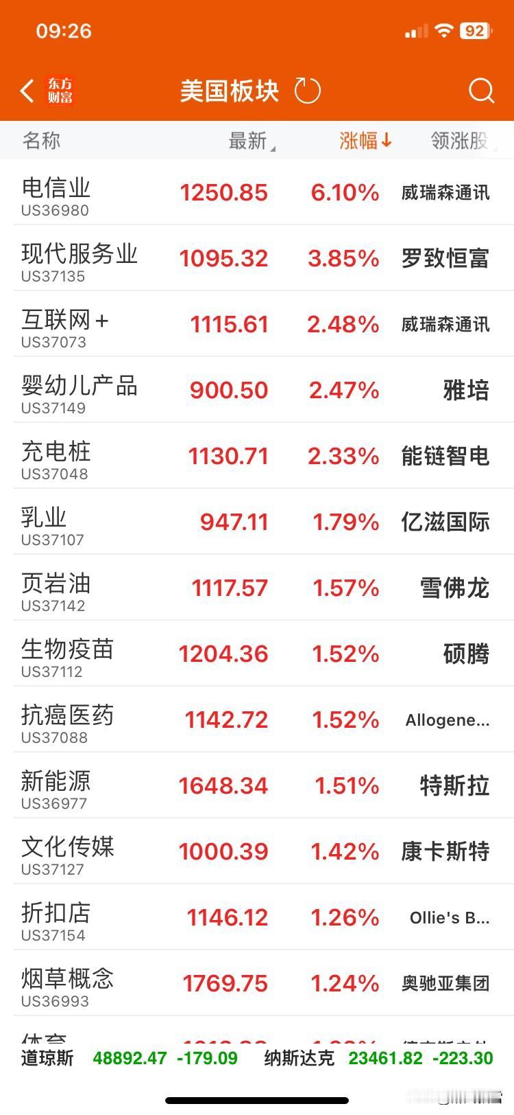 美市收盘 美股三大指数集体收跌,道指跌0.36%,纳指跌0.94%,标普500跌0.43%。龙指数跌2.36 %。 领涨板块:电信业(+6.10%)、现代服务业(+3.85%)、互联网+(+2.48%)、婴幼儿产品(+2.47%)、充电桩(+2.33%)。 科技普跌,市场呈现板块分化,资金流向刚需相关板块,中概股等成长板块表现偏弱。
