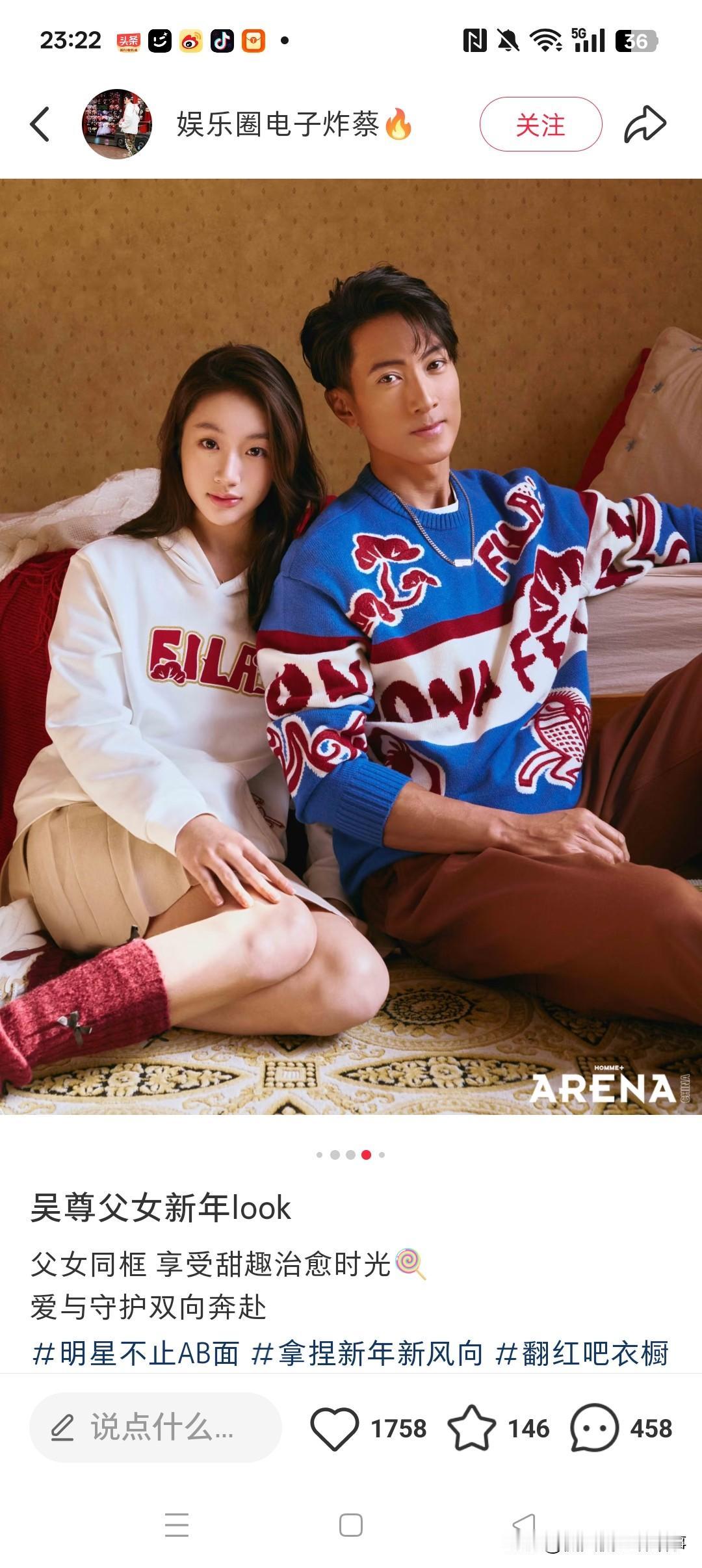 吴尊与neinei父女新年杂志同框,别的画面都还好,唯独拖领带的动作看着格外不妥,不少人第一眼刷到都以为是偶像剧CP剧照。 这pose明显是照搬了男女拍照模板,完全忽略了父女的人物关系,再加上吴尊看着太年轻,违和感直接拉满。更费解的是,观众都能看出不妥,从策划、摄影到本人却没人察觉,很难不怀疑是故意制造误会博噱头。 抛开争议,neinei的颜值很能打,眉眼和吴尊超像,五官比例、脸型都出众,还自带高级感,就是这次的妆容不太适配,换个眉型应该会更出彩。 你第一眼看到这组照片,有没有认错成CP图?