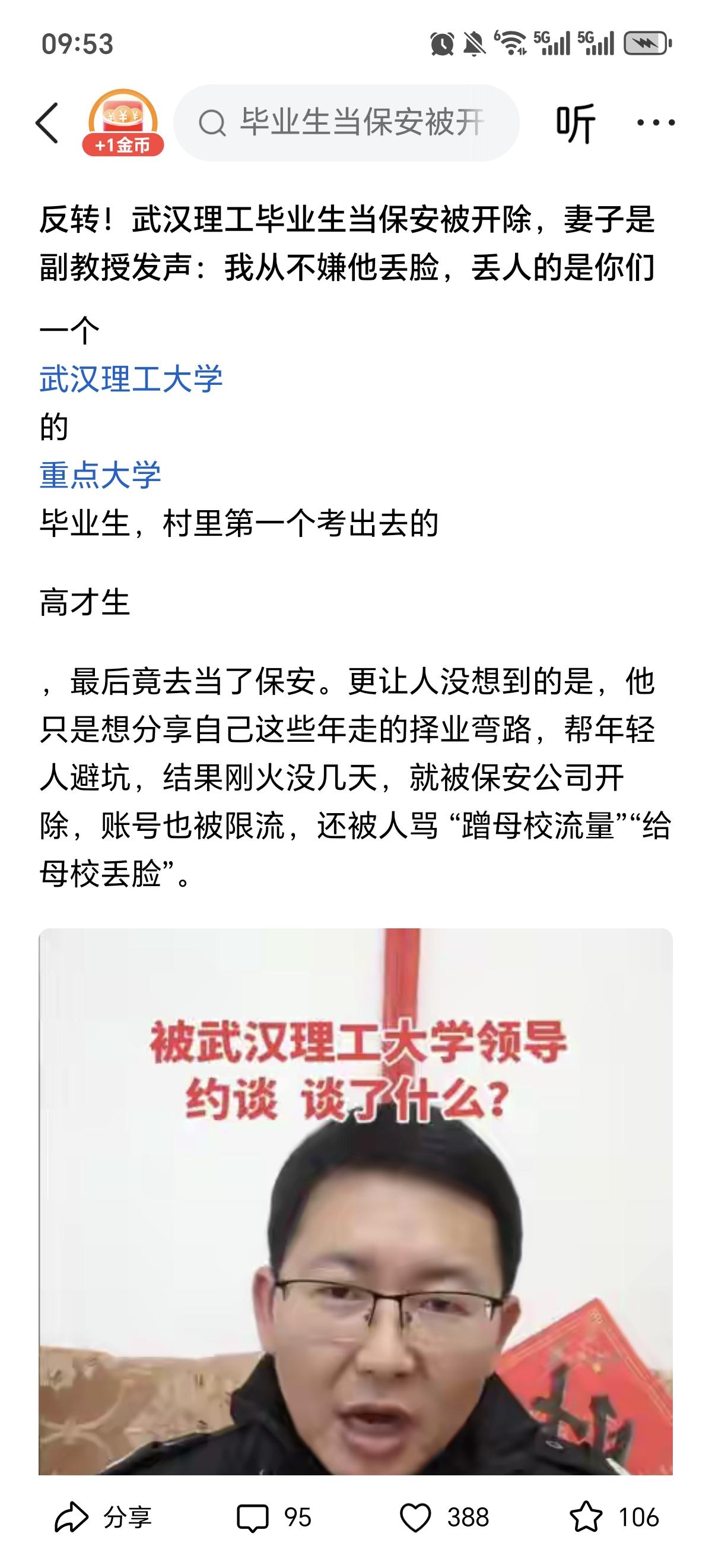 如今干保安就是“丢人”吗? 武汉理工大学毕业的就不能应聘保安吗?就要被学校“约谈”? 什么时候做一份普通工作成了“低端”、“低等”、“低级”了? 过去那种“干一行爱一行”的思想觉悟早已扔到“爪哇岛”去了,如今只要挣钱少,服务行业就被人“看不起”,被“诟病”。 一个毕业多年,因为求职不顺做了保安的理工大学学生竟然要被学校约谈?学校咋不回回炉再造一下?约谈什么呢?非常好奇呀! 当一个社会再也不尊重普通劳动者时,不是悲哀是什么?过去的全国劳模掏粪工时传祥,采油工王进喜,普通士兵雷锋,“农民铁姑娘”郭凤莲是全国人民的学习崇拜的榜样,现如今坐在台上领奖的都是“精英”、“行业领袖”、“董事长、总裁”等等,难怪当保安“辱没”了母校?难怪所谓精英人士和那些各类“二代”、“三代”看不起普通劳动者们… 早就时代的难道不是千千万万的普通劳动者?没有普通劳动者,那些“精英”们真的不会“chishi”?