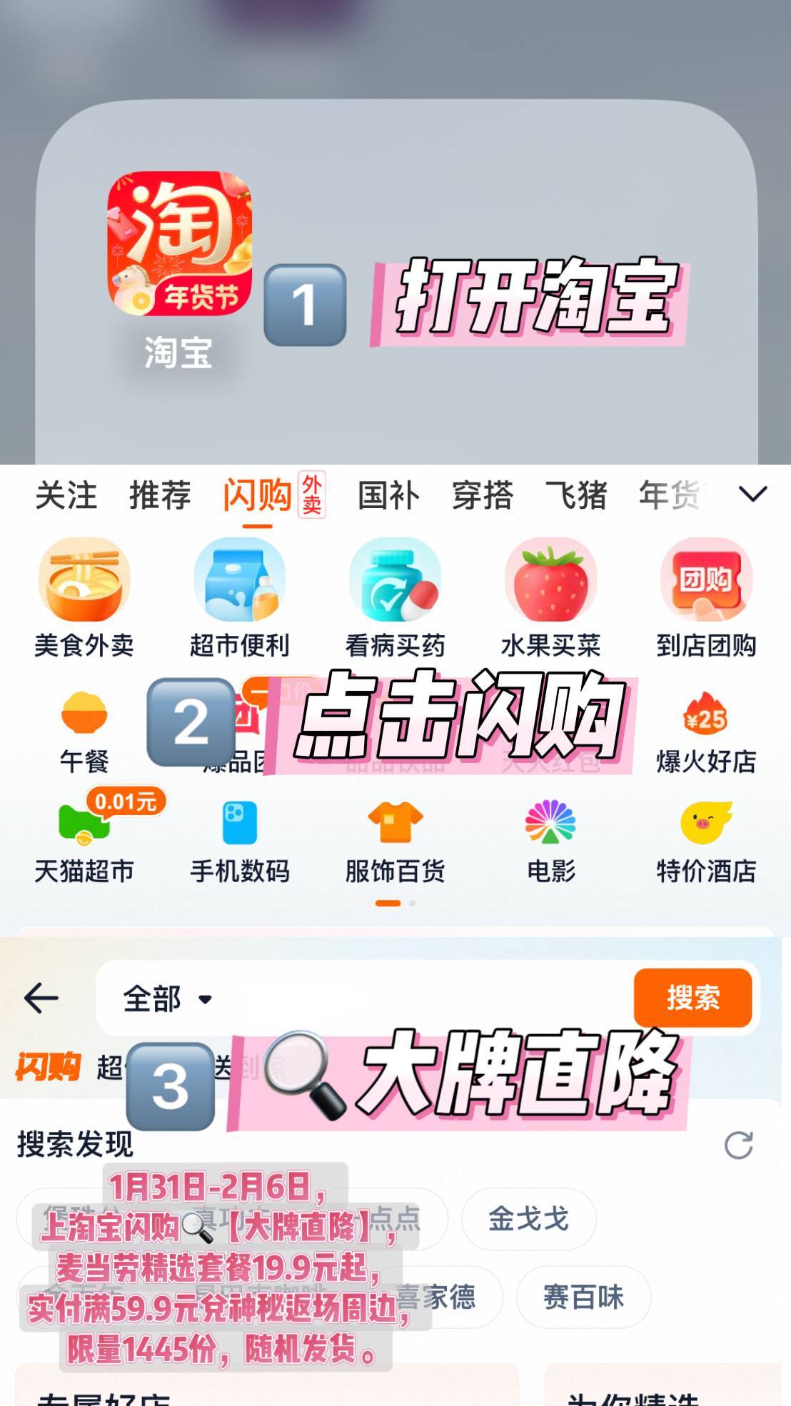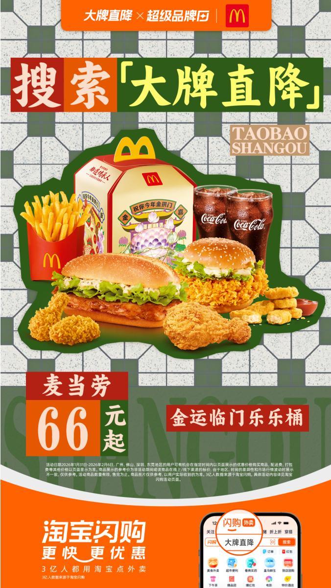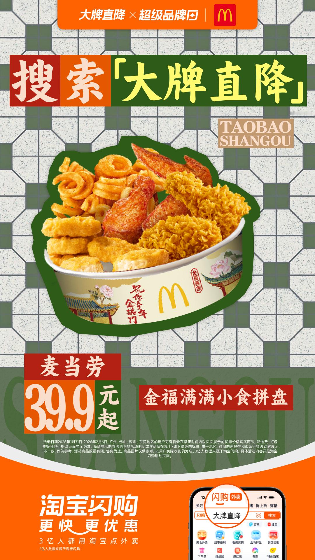 午餐聚餐不用愁,淘宝闪购大牌直降,大牌“金拱门”来撑场子!淘宝闪购麦当劳直降解锁新春福袋金运临门乐乐桶66元起,一桶炸鸡薯条分量超足;金拱门虾堡四件套42.9元起,经典搭配不出错。追求厚实口感就点菠萝安格斯厚牛堡四件套56.9元起,大堡口福四件套只要19.9元起,里面还有Hold 不住鸡排堡,性价比无敌!1月31日-2月6日,上淘宝闪购搜【大牌直降】,麦当劳精选套餐19.9元起,实付满59.9元兑神秘返场周边,限量1445份,随机发货!
