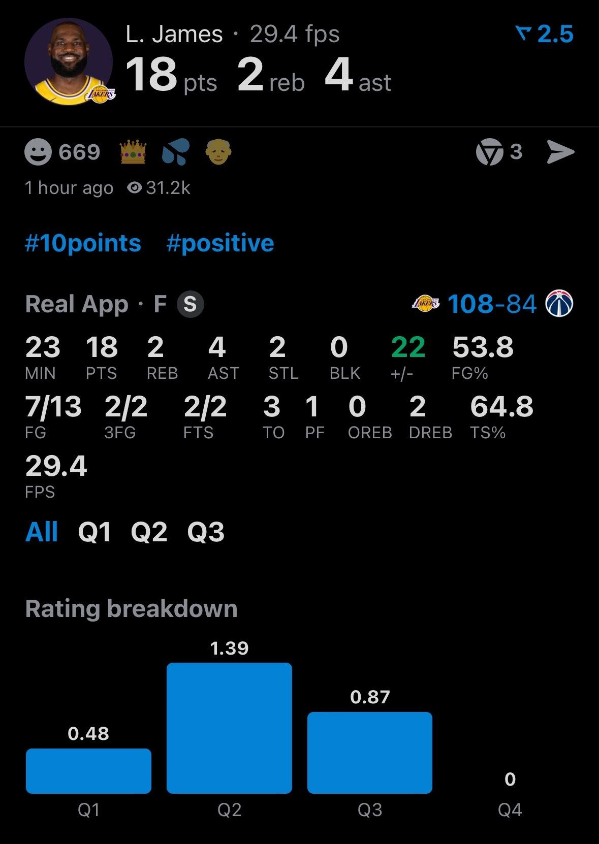 湖人强行加戏!三节结束,湖人108-84奇才,只领先24分了!奇才最后打出一波14-3高潮。 看来詹姆斯末节还不能休息,本场比赛23分钟18分。