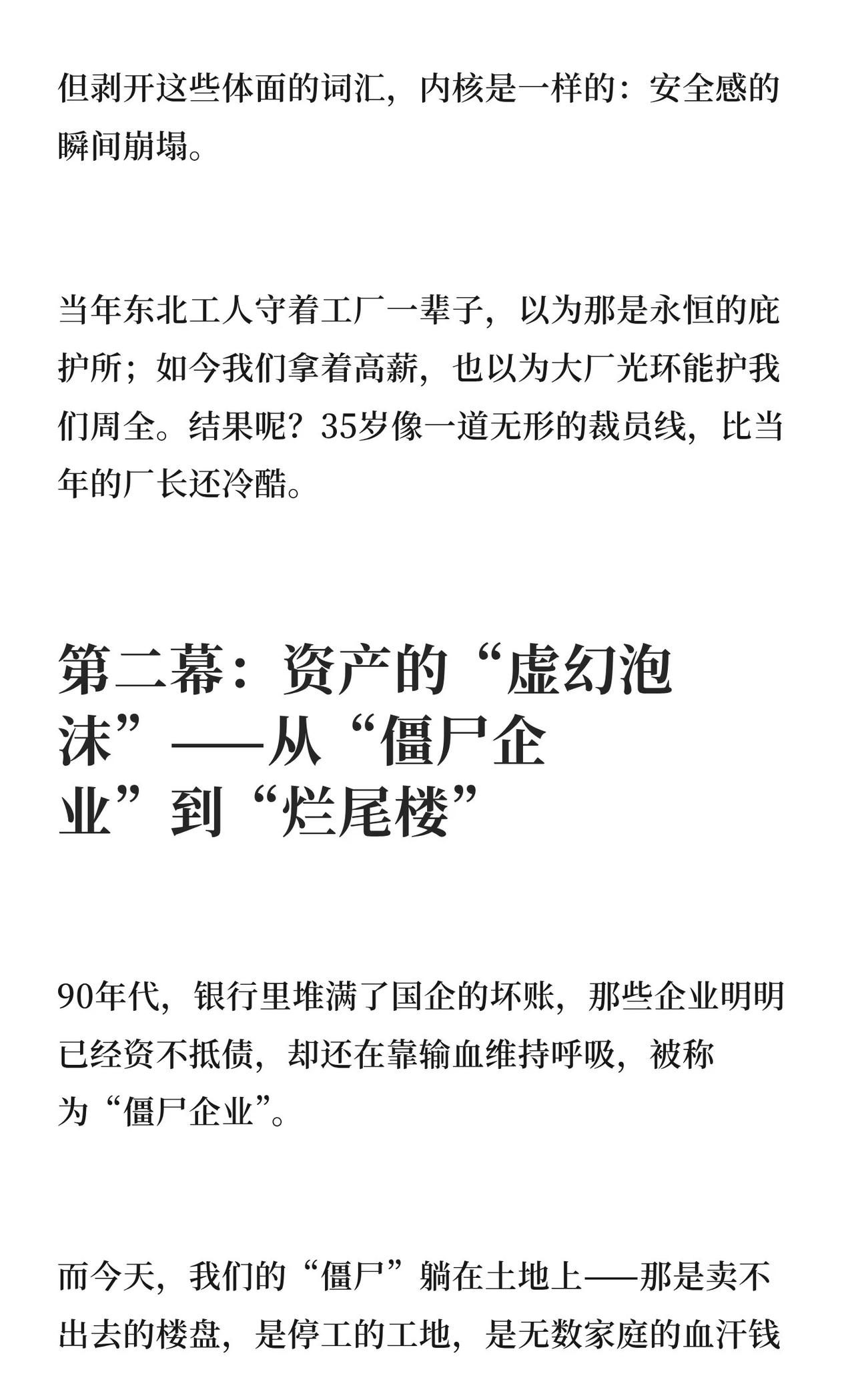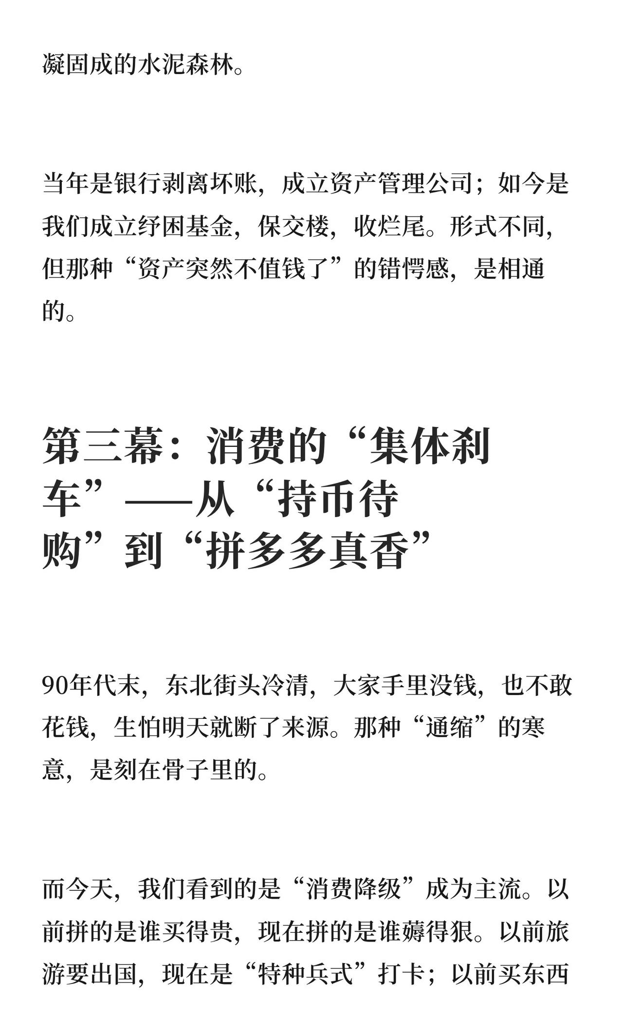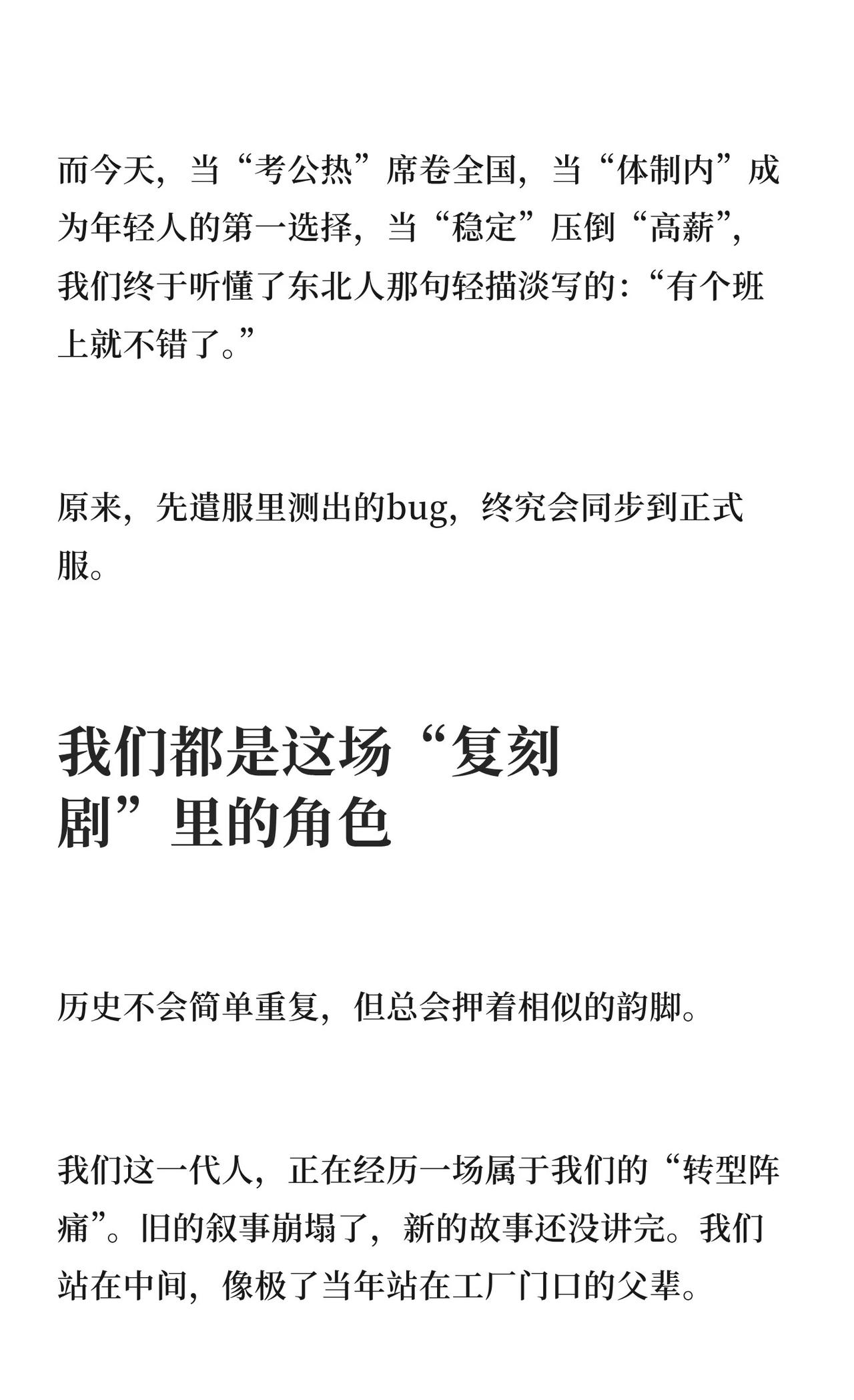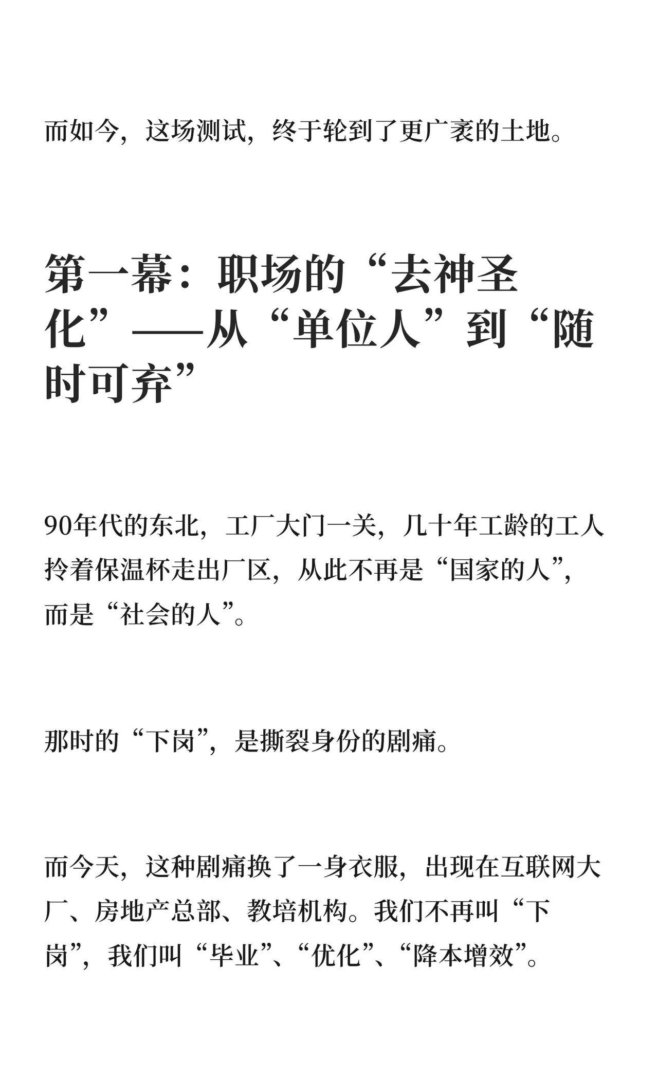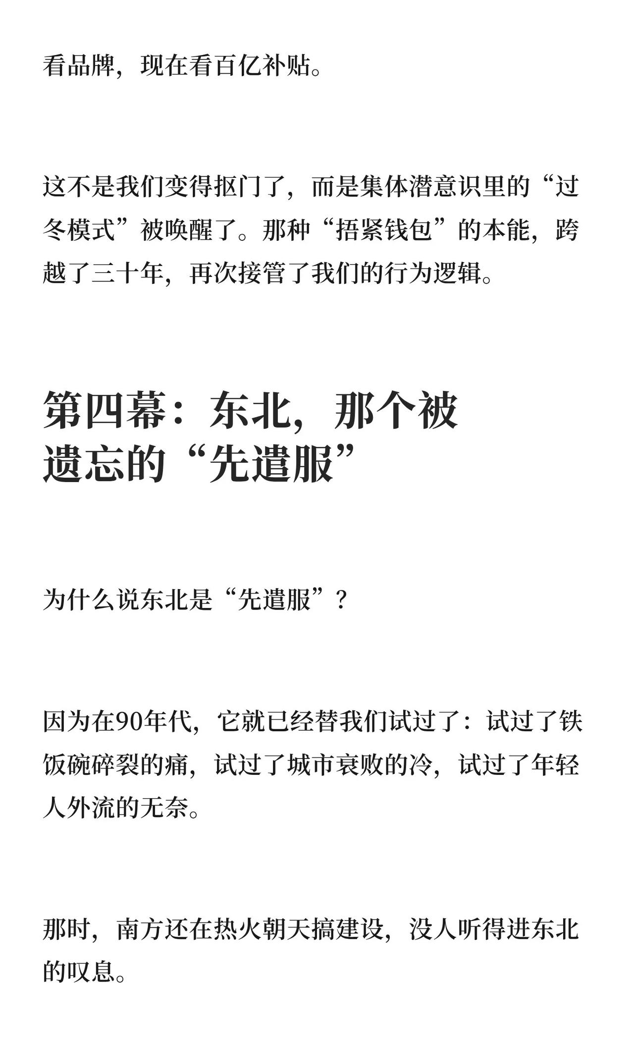 我们正经历一场“延迟三十年”的社会实验: 我们正经历一场被时间延迟的“社会重演”,从职场去神圣化到消费降级,东北作为“先遣服”已先行测试。如今,这些变化轮到更广袤的土地,提醒我们面对转型阵痛,少走弯路,多存暖意。 90年代 东北 社会观察 经济 职场 消费降级 时代变迁 先遣服 我们这一代