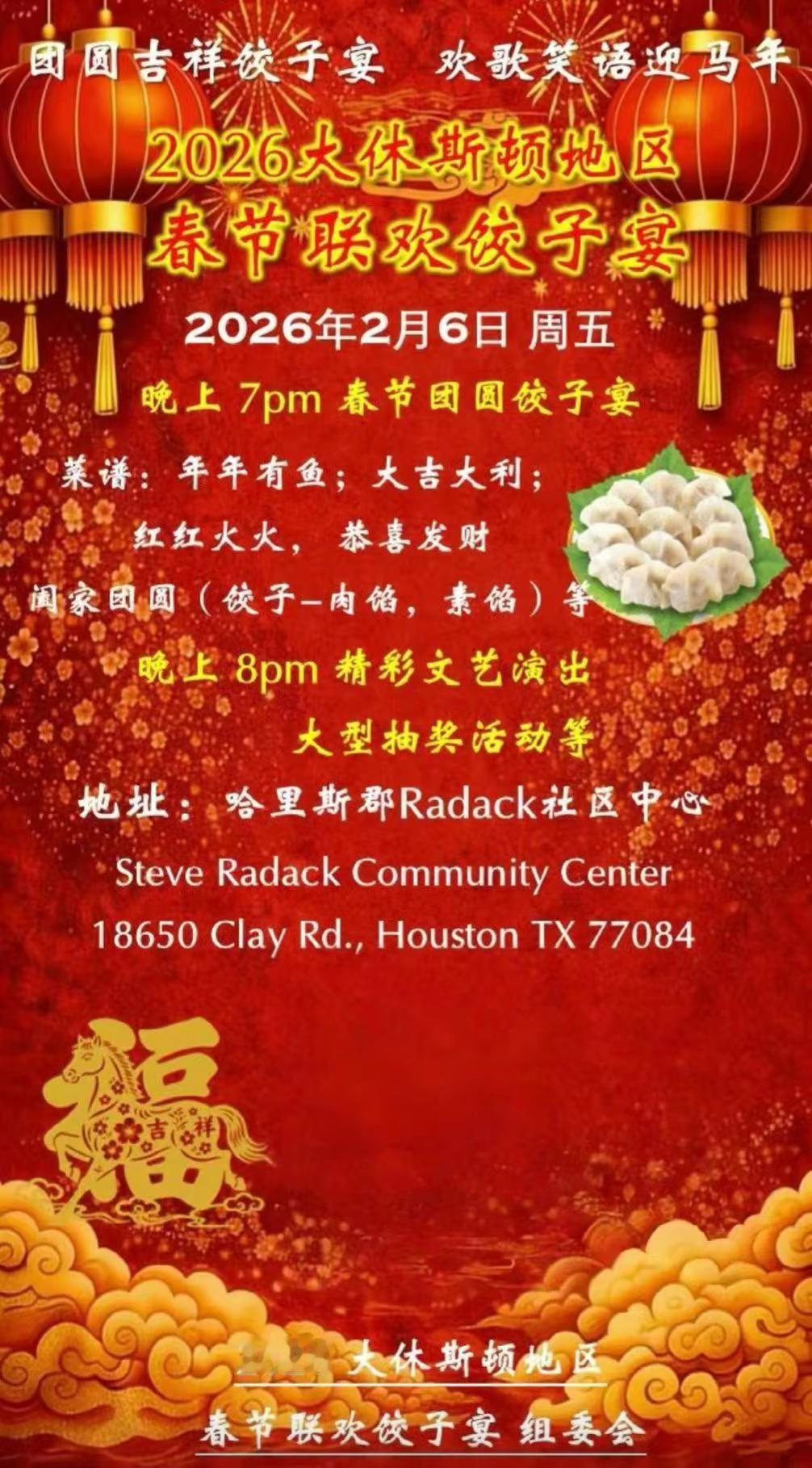 美国🇺🇸2026大休斯顿地区春节饺子宴 拳拳赤子心 以侨为桥团圆饺子香,歌舞迎马年——新春盛宴,就差你一个!2026年2月6日(周五)晚7点,我们不见不散!▸ 19:00 暖心开宴|亲手包饺子、品年味,一口咬出团圆吉祥▸ 春节特供吉祥菜谱:年年有鱼,龙马精神,大吉大利,红红火火,四季发财,百财聚福,吉祥如意,阖家团圆(荤素饺子)等……道道寓意美满,荤素皆备!▸ 20:00 好戏登场|,文艺演出轮番上阵,歌舞、曲艺嗨翻全场,更有大型抽奖惊喜不断,好运说不定就砸中你! 地点:Steve Radack Community Center(18650 Clay Rd, Houston, TX 77084)温馨场地,年味十足,与老乡邻里共度一个热闹欢腾的中国年!这个马年,让我们以饺传情、以歌会友、以奖添彩——共创一份温暖的团圆记忆!主办:大休斯顿地区2026春节联欢饺子宴组委会