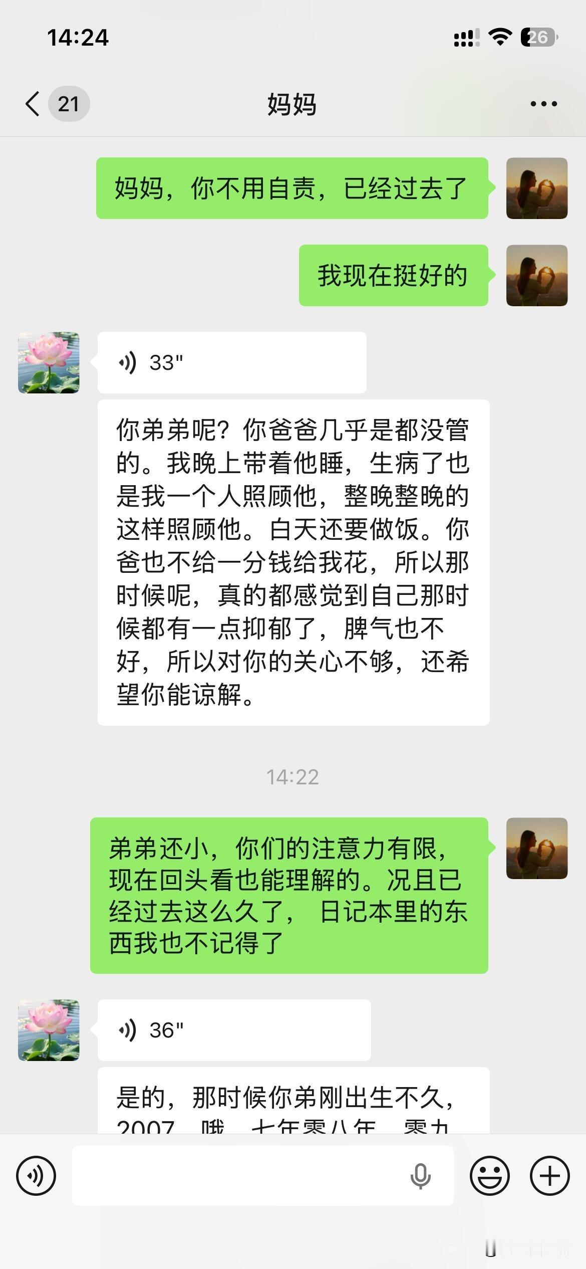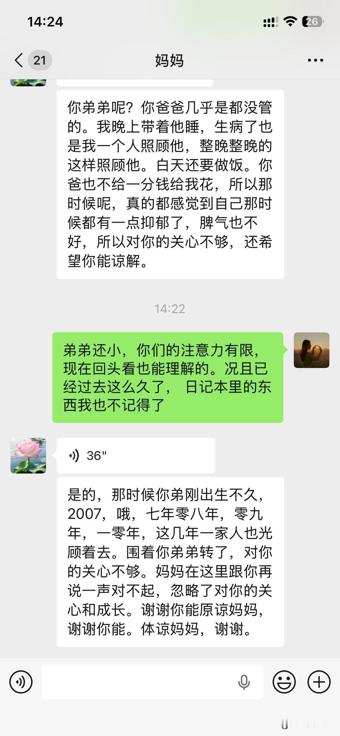 迟来10年的道歉 小时候我在老家给爷爷奶奶拉扯大,也就是大家口中的留守儿童。一直不觉得自己苦,反而在乡下玩得很开心自在。 后来3年级被妈妈接到广东,呆在妈妈身边,5年级我跟妈妈一起到爸爸身边。 幸福时光很短暂,也就获得两年父母偏爱的时光;我读初一的时候,我弟弟就出生了。我从初一开始住校,一直到大学毕业。 家里重男轻女很严重,弟弟像是一块宝玉被呵护着,而我像是一个被遗忘的人。只有努力学习,考试考高分,哪怕只是成为父母在外炫耀的资本,我也心甘情愿,只要父母多看我一眼… 现在长大了,嫁人了,遇到良人,过得很好。前尘往事渐渐淡忘,妈妈在家里突然翻到了我初中时写的笔记本,虽然我不记得我自己写过什么。 但是我脑子里,能回忆起那段时光的痛苦。 听着妈妈突然发给我的道歉语音….鼻子一酸,眼睛逐渐模糊,原来,虽然我忘记了笔记内容,但是我那时的锥心难过,一点也没有忘记。 此刻,虽然嘴上想安慰妈妈,没事了都过去了,但是内心没办法释怀….