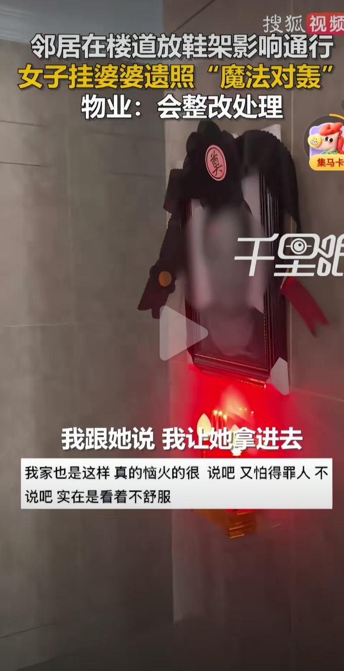 俗话说远亲不如近邻,碰上善解人意的邻居,感觉相见恨晚,但如果碰上没有道德素质的邻居,就像吃了满口的泥沙让人添堵。 湖南张家界的熊女士就碰到了添堵的邻居,本来通行的楼道就很狭窄,但邻居家却在楼道旁放置多层鞋架,并紧贴自己的房门,使本就狭窄的通道更为狭窄。不但臭气熏天,使人恶心,出门还多次撞倒鞋架,还得帮其拾起掉地的鞋子。 熊女士与邻居沟通多次但仍我行我素,物业多次上门劝解,并依据《消防法》下达整改通知,但邻居以“家中空间小放不下”为由拒绝搬离。 熊女士绞尽脑汁终于想出应对方法——挂出婆婆遗照,在遗照下供上香烛,以魔法对轰! 但邻居也毫不示弱,向遗照扔臭鸡蛋,熊女士丈夫一气之下踹毁了邻居的鞋架。目前鞋架虽清理,但邻居仍不服气,放一只臭鞋在过道示威。 你看,贪上这样的邻居是不是给自己生活添堵? 楼道本是公共空间,邻居却把公共区域当成自己的私人领地,全然不顾他人的感受。把鞋柜放置于楼道,既挤占了公共空间,给他人造成不便,又将臭味释放出来,污染环境。 所谓的“魔法对轰”,是绞尽脑汁的无奈之举,虽不是最优策略,但确实是最有效的方法。 只不过用老人的遗像作为攻击的武器,确实违背公序良俗,不但亵渎逝者尊严,而且会加剧双方矛盾,使矛盾升级。 所以,维权应该在法制的框架下进行,虽然耗时更长,但是最理智化解矛盾的方式,让邻居真正认识到自己的错误。毕竟邻里之间不是匆匆过客,而是要相处一辈子的街坊。低头不见抬头见,和气生财,和睦相处才是长久之道。 你说是不是这个理?
