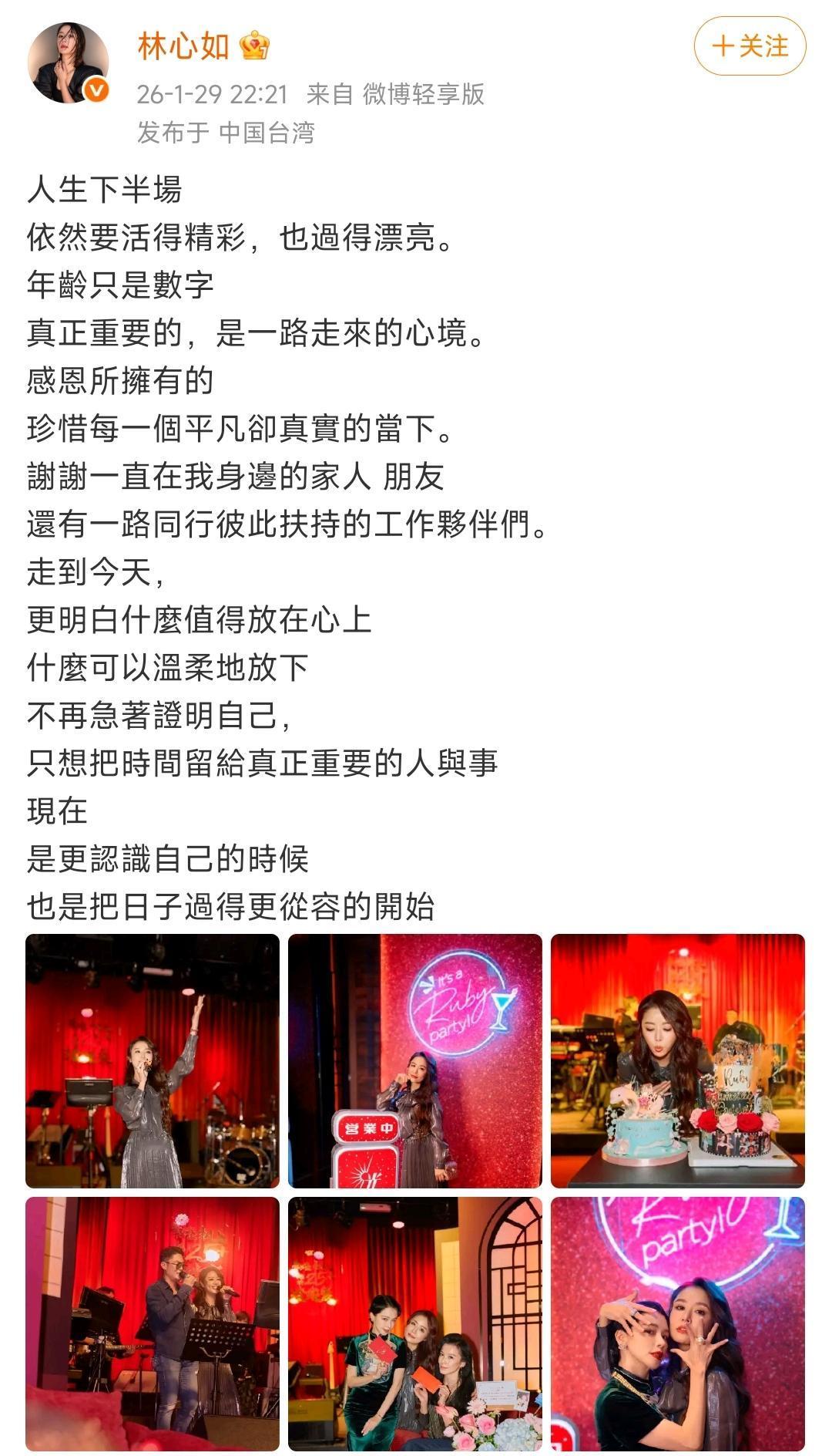 1月29日林心如50岁庆生晒手写感言刷屏,文案尽显人生下半场的从容通透,直言年龄是数字、心境最珍贵,懂得取舍且珍惜身边亲友与当下;庆生宴她复刻《华灯初上》造型超美,霍建华高调现身同台合唱破婚变传闻,徐若瑄等好友齐聚,粉丝应援暖心;她从紫薇格格转型金牌制片人,30年演艺路成绩亮眼,50岁活成事业家庭双丰收的女性榜样,感言也给中年人带来启示。林心如分享50岁生日派对照片 林心如