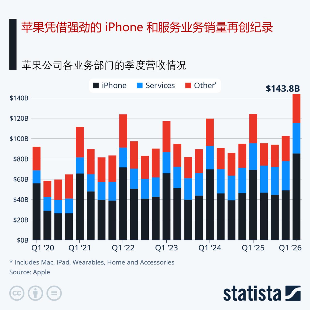 凭借强劲的 iPhone 和服务业务,2026 财年第一季度苹果销量再创纪录 1月29日,苹果公布了其 2026 财年第一季度的收益报告,业绩全面超出分析师预期。营收达 1438 亿美元,苹果不仅打破了此前的纪录,还超越了这一纪录。在上一季度之前,就销售额而言,苹果的最佳季度是 2024 年假日季,当时营收为 1243 亿美元,与新的纪录相差近 200 亿美元。苹果的利润也出现了类似的增长,从去年同期的 363 亿美元跃升至截至 2025 年 12 月 27 日的三个月内的历史最高水平 421 亿美元。 总销售额同比增长了 16%,这是自 2021 年新冠疫情后复苏以来苹果公司增长最为强劲的一个季度,公司要为此感谢 iPhone 及其不断扩大的服务业务部门。上个季度 iPhone 销量飙升 23%,达到 850 亿美元,这是迄今为止的又一个新纪录。服务业务收入增长了 14%,达到 300 亿美元,仅三年后就首次突破 200 亿美元大关。苹果公司的其他产品表现相对平稳,Mac、iPad、Home 和可穿戴设备的总销售额同比下降 1%,至 285 亿美元。 值得注意的是,苹果公司报告称其在各个报告区域的销售额均实现了显著增长,其中包括大中华区,其增长幅度接近 38%。这标志着苹果在重要的中国市场出现了重大转机,此前该市场的销售额在过去 12 个季度中有 10 个季度出现了下滑。展望未来,苹果公司警告称可能会出现供应限制,这将影响其未来的利润率。由于全球数据中心的蓬勃发展,预计未来一段时间内内存芯片将供不应求,从而导致相关公司(如苹果公司)面临更高的价格和压缩的利润率。 为了反驳有关苹果在人工智能领域落后于其他公司的普遍说法,蒂姆·库克大力称赞了苹果智能功能的广泛应用,并称苹果设备“无疑是全球最出色的人工智能应用平台。”