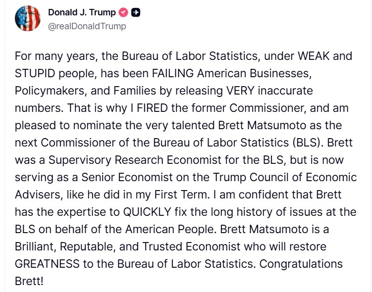 阿川不满统计数据而解雇了劳动统计局局长后,宣布提名布雷特·松本为新任劳动统计局局长