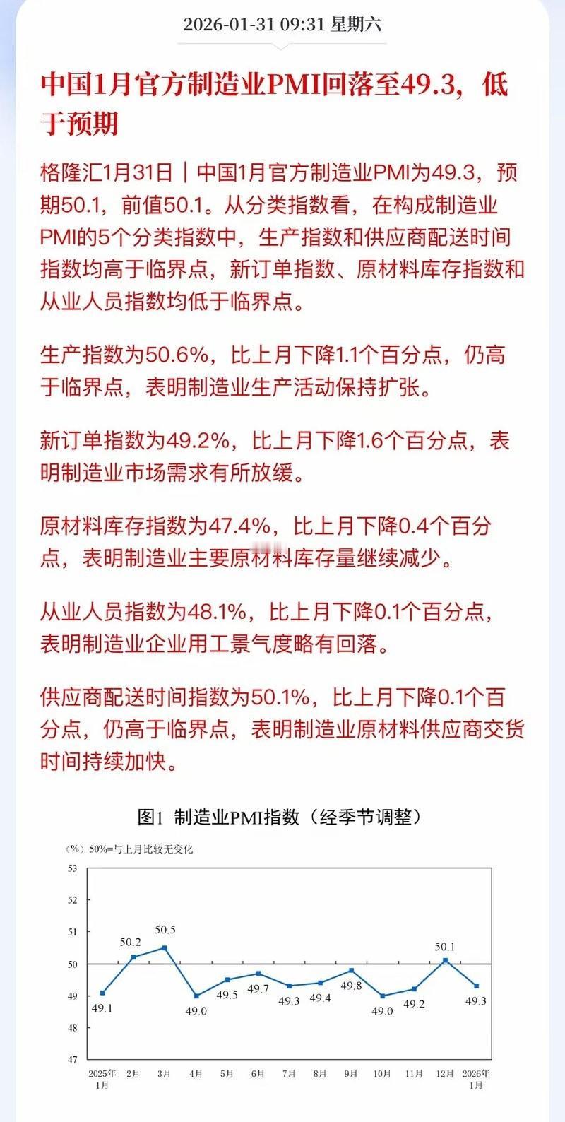 刚刚,1月份官方制造业PMI数据出炉,这49.3远低于50.1的前值和预期,生产订单、新订单、原材料库存、从业人员等具体数据,均大幅降低。 股市是经济的晴雨表,大A的温度大致还要与宏观经济数据相匹配。不知指责降温、呼唤疯牛的人,哪来的底气? 所以,大A走慢牛还是有依据,而且这牛市仍然是结构性的,爱谁追谁还得瞄准高景气。像续亏至820亿的万科这样的老登,没有晴天只有黄梅雨。