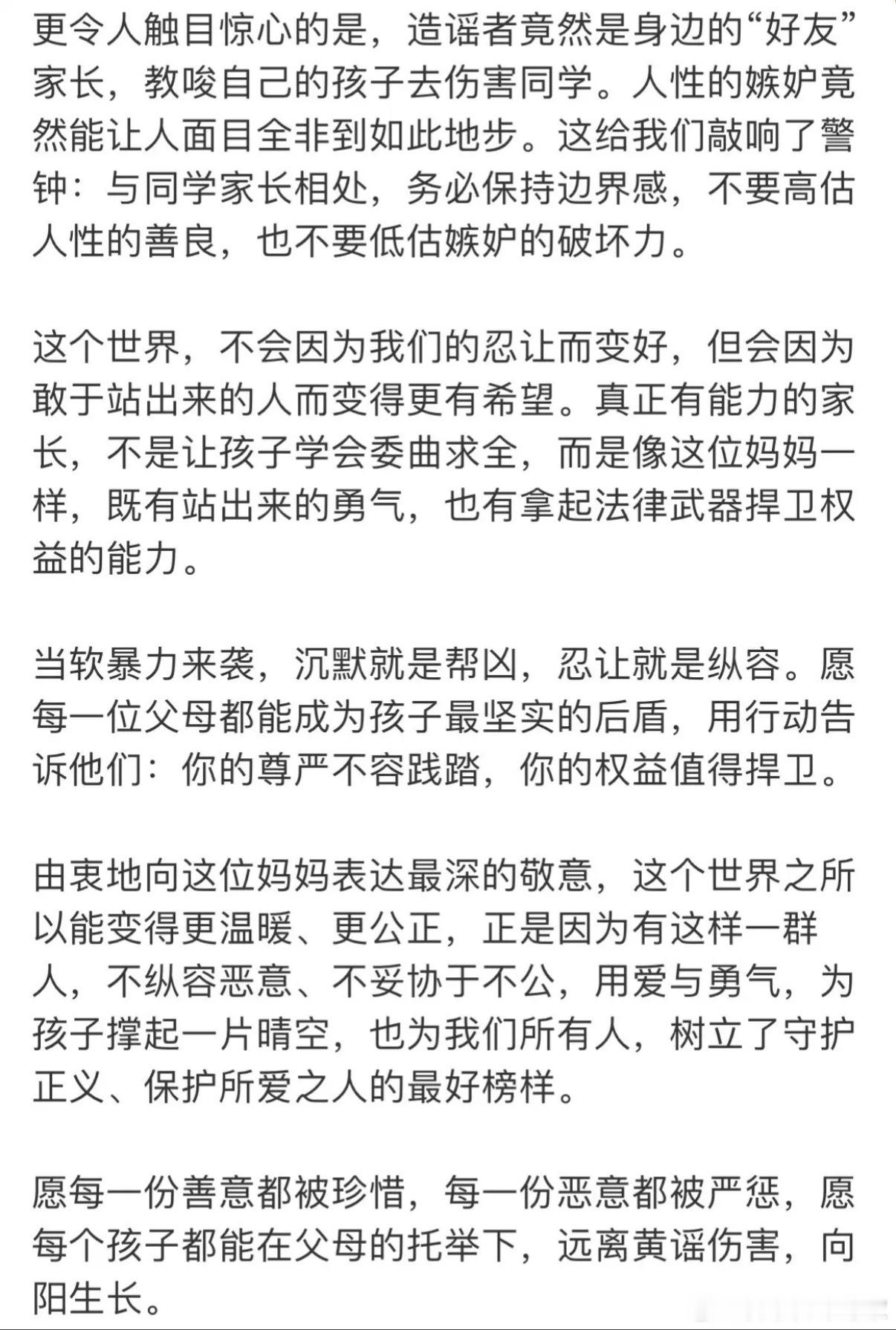 支持这位母亲,不要觉得忍一忍就过去了,对于造谣的那些人来说,只会变本加厉,一定要严惩女儿被造黄谣妈妈果断报警维权