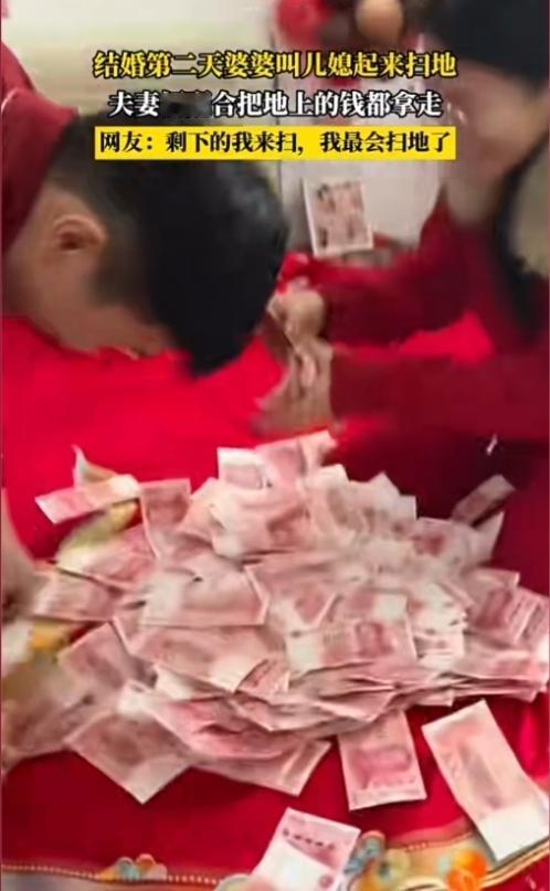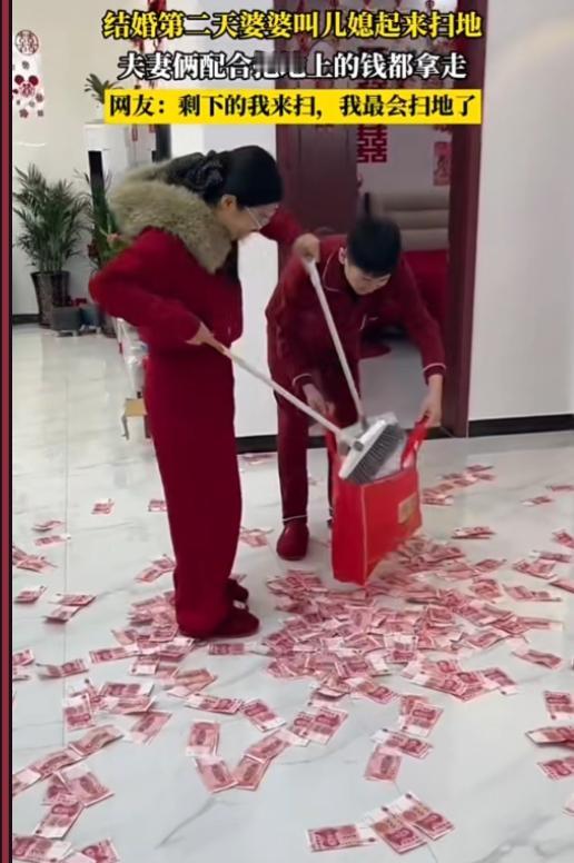 这风俗好,我羡慕! 河南,结婚第二天婆婆叫儿媳起来扫地,满地的红钞票,夫妻俩配合,一个扫,一个装,很快就满载而归。小两口躲房间床上,数钞票了。 这种场面,我只有在梦里见过。不过,他们竟然把人民币扔地上扫,还用脚踩人民币,太不尊重人民币了。 有钱都不拿,还没扫干净就进屋了,真奇怪!有人懂为什么吗?