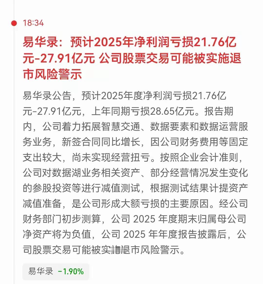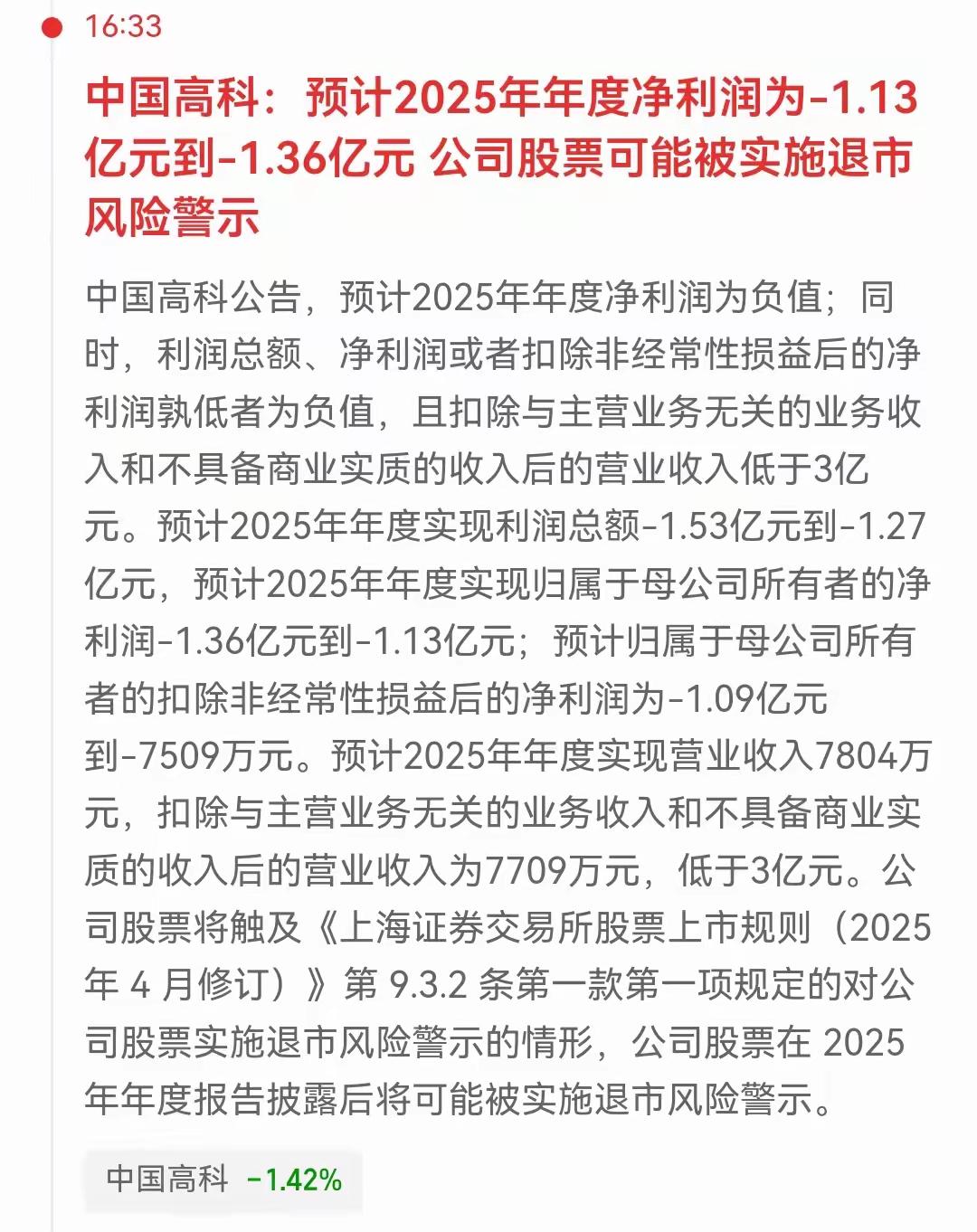 年报后,股票st股风险预警 准退市股 退市风险警示股 “戴帽”预警自查名单退市个股 (2026年5月6日起实施) 1. 600340 华夏幸福 2. 600537 亿晶光电 3. 002977 天箭科技 4. 605336 帅丰电器 5. 600581 八一钢铁 6. 002883 中设股份 7. 600119 长江投资 8. 920023 田野股份 9. 920670 数字人 10. 600187 国中水务 11. 002227 奥特迅 12. 000826 启迪环境 13. 300027 华谊兄弟 14. 300212 易华录 15. 002634 棒杰股份 16. 688622 禾信仪器 17. 600730 中国高科 18. 000610 西安旅游 19. 600476 湘邮科技 20. 603429 集友股份 21. 300295 三六五网 22. 002501 利源股份 23. 000911 广弘糖业 24. 002694 顾地科技 25. 002547 春兴精工 26. 603718 海利生物 27. 000838 财信发展 28. 000056 皇庭国际 29. 000016 深康佳A 30. 600543 莫高股份 31. 600889 南京化纤 32. 688066 航天宏图 33. 002175 东方智造
