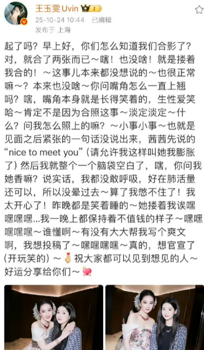 王玉雯追星刘亦菲简直太让人感同身受啦, 早年就想做朋友,合照乐开花,追星成功开心到笑睡,还有专属语音,直呼心理委员都不用来啦