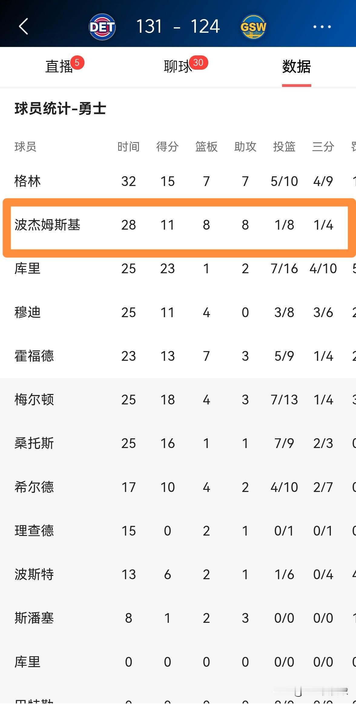 我强烈建议勇士立刻交易走波杰姆斯基!在今天勇士主场以124:131输给活塞的比赛中,波杰姆斯基在投篮端的表现简直是惨不忍睹,他在首发出战的28分钟里,投篮8中1,其中三分球4中1、罚球9中8极其低效的得到11分,还出现了4次失误,他的场上正负值为-7。 事实再次证明,以波杰姆斯基的能力来看,他完全没有资格成为库里的接班人,勇士应该趁早将波杰姆斯基交易走。