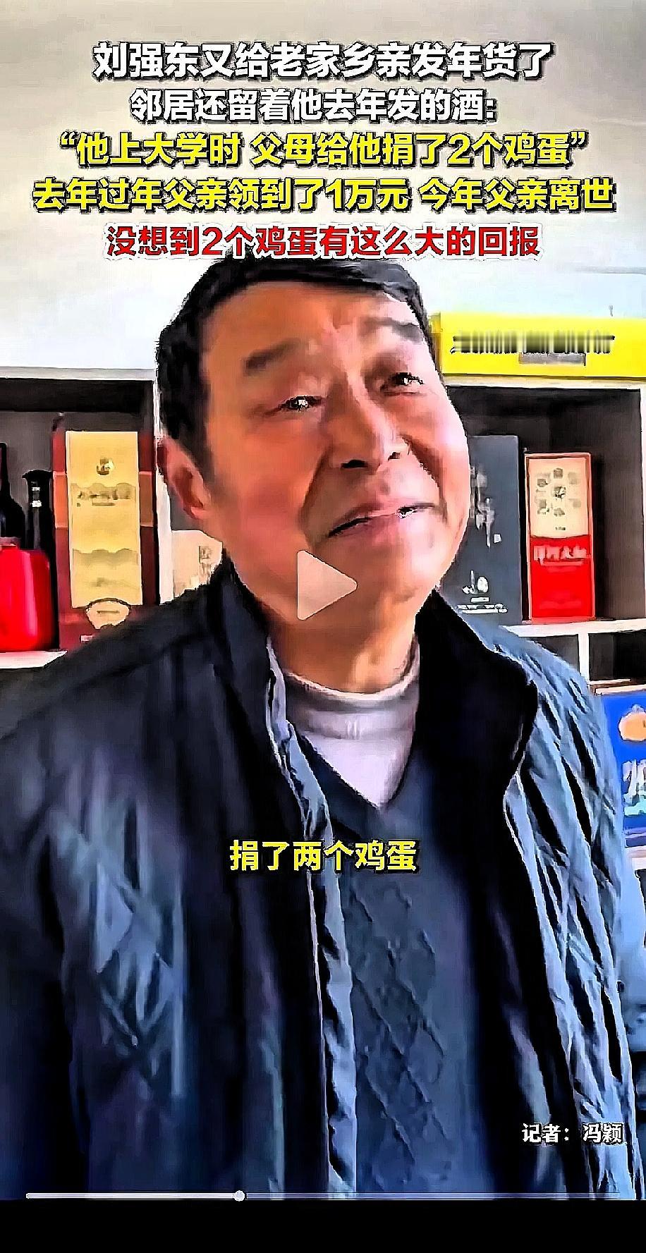 因两个鸡蛋被刘强东记挂的大叔 今年没收到那一万块现金了 只因当年送鸡蛋的老父亲离世,这份懂分寸的惦念,比什么都动人。 当年不过是两个普通的鸡蛋,却是困境里最珍贵的善意,刘强东记了几十年,年年用实际行动回馈。去年的红包余温还在大叔心底,老父亲留下的两瓶好酒被他仔细珍藏,落灰就擦,这酒里装的,是普通老人和他结下的暖心缘分,也是岁月里难得的温柔。 今年现金虽没如约到,但送年货的卡车依旧准时登门,米面粮油满满当当堆成小山,红通通的年货映着院里的空落,大叔站在院中久久没挪动脚步。故人虽走,可这份情分半点没散,该有的惦念,从来都没少过。 最难得的不是持续的物质回馈,而是这份刻在骨子里的分寸感和感恩心。恩归恩,情归情,给老人的敬意从不少半分,故人离世便适时换了陪伴的方式,从不用功利衡量这份纯粹的真情,这从来都不是冷冰冰的交换,而是最真诚的知恩图报。 小事最能见人品,真正的善良,从来都藏在这些细枝末节里。拎得清分寸,守得住真心,把一份微小的善意记挂几十年,这样的情义,才是人间最珍贵的温暖。