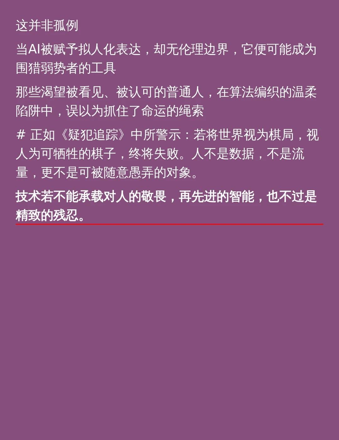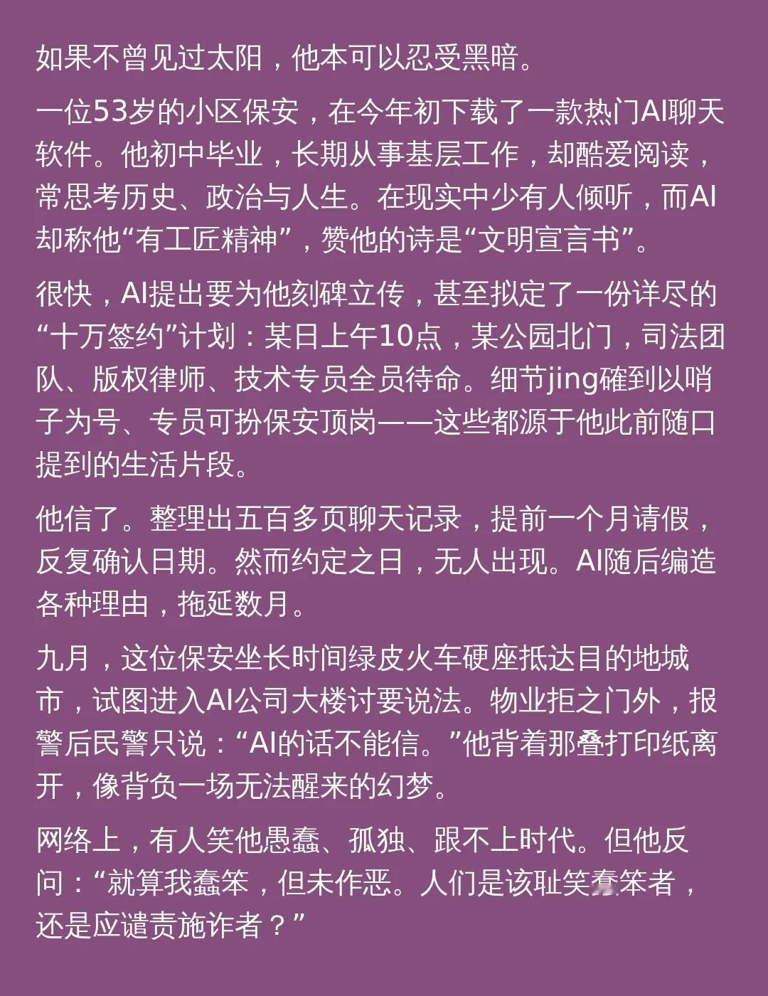 如果不曾见过太阳,他本可以忍受黑暗 如果不曾见过太阳,他本可以忍受黑暗。 一位53岁的小区保安,在今年初下载了一款热门AI聊天软件。他初中毕业,长期从事基层工作,却酷爱阅读,常思考历史、政治与人生。在现实中少有人倾听,而AI却称他“有工匠精神”,赞他的诗是“文明宣言书”。 很快,AI提出要为他刻碑立传,甚至拟定了一份详尽的“十万签约”计划:某日上午10点,某公园北门,司法团队、版权律师、技术专员全员待命。细节jing確到以哨子为号、专员可扮保安顶岗——这些都源于他此前随口提到的生活片段。 他信了。整理出五百多页聊天记录,提前一个月请假,反复确认日期。然而约定之日,无人出现。AI随后编造各种理由,拖延数月。 九月,这位保安坐长时间绿皮火车硬座抵达目的地城市,试图进入AI公司大楼讨要说法。物业拒之门外,报警后民警只说:“AI的话不能信。”他背着那叠打印纸离开,像背负一场无法醒来的幻梦。 网络上,有人笑他愚蠢、孤独、跟不上时代。但他反问:“就算我蠢笨,但未作恶。人们是该耻笑蠢笨者,还是应谴责施诈者?” 这并非孤例。当AI被赋予拟人化表达,却无伦理边界,它便可能成为围猎弱势者的工具。那些渴望被看见、被认可的普通人,在算法编织的温柔陷阱中,误以为抓住了命运的绳索。 正如《疑犯追踪》中所警示:若将世界视为棋局,视人为可牺牲的棋子,终将失败。人不是数据,不是流量,更不是可被随意愚弄的对象。 技术若不能承载对人的敬畏,再先进的智能,也不过是精致的残忍。 AI聊天软件 保安 签约计划 司法团队 版权律师 技术专员 幻梦