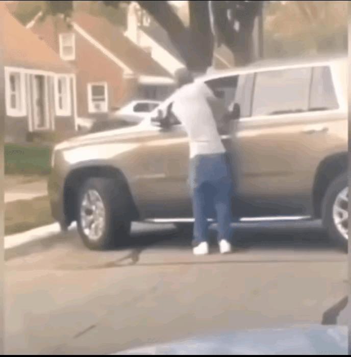 马路边上,一名戴鸭舌帽的男子,突然朝一辆越野车走去。 当他走到越野车门时,二话