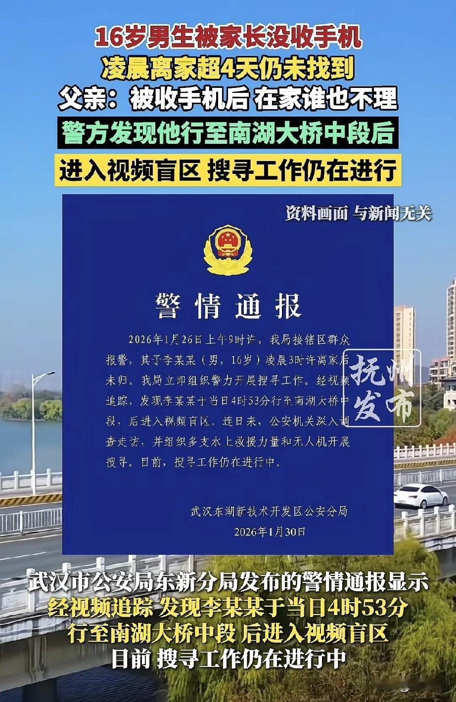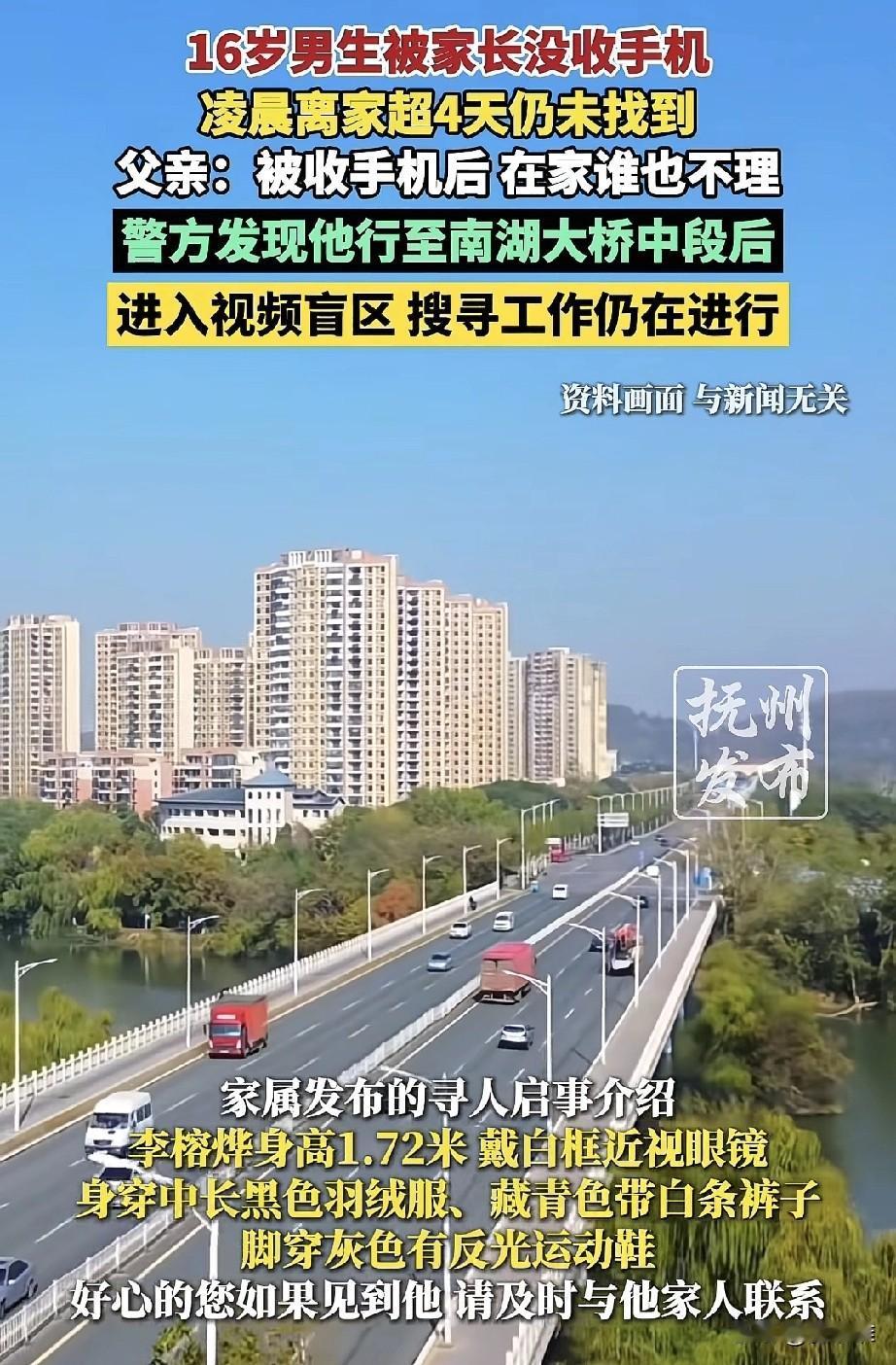 说不得,打不得,骂不得!武汉16岁男生李榕烨,因为周末通宵玩手机被父母说了几句,手机也被收走。没想到1月26号凌晨,他趁爸妈睡着,一个人悄悄离家出走,到现在已经5天没消息。 他走的时候没带手机、没带钱,最后出现在南湖大桥附近。孩子身高1米72,戴白框眼镜,离家时穿着黑色羽绒服、藏青色带白条的裤子和灰色反光运动鞋。家人非常着急,如果有谁见到他,请立刻联系他的家人。拜托大家留意一下!