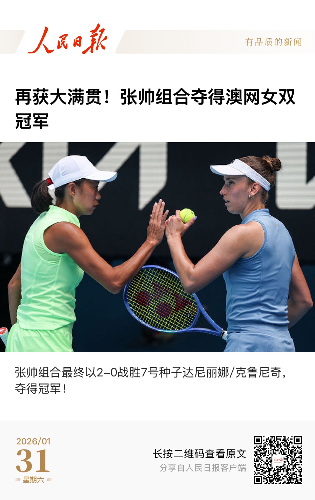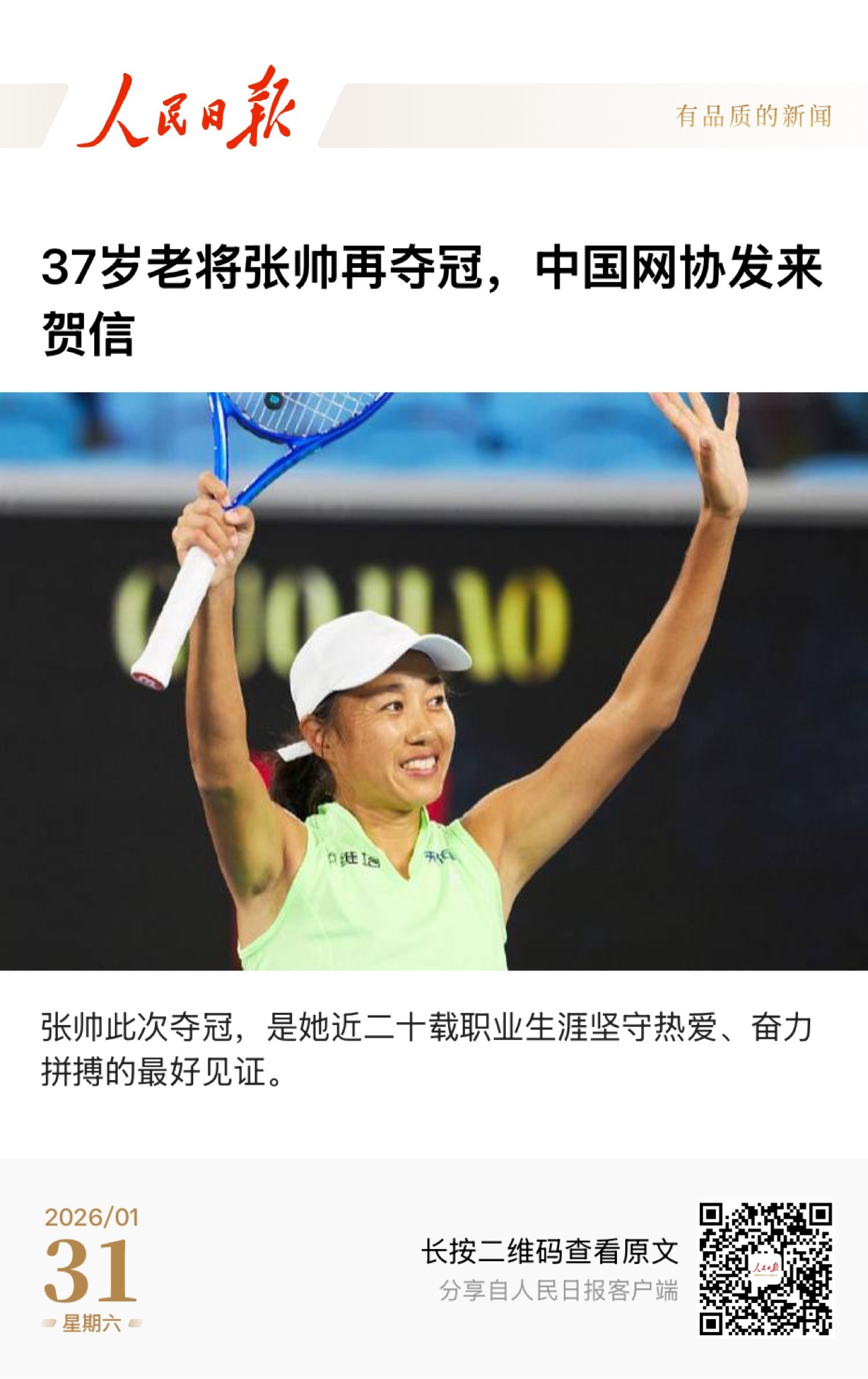 在张帅组合获得2026澳网女双冠军后,中国网球协会于31日向张帅发出贺信,表示张帅此次夺冠,是她近二十载职业生涯坚守热爱、奋力拼搏的最好见证。从年少踏入职业赛场,到历经低谷从未言弃;从2019年首夺澳网女双冠军,到2021年美网折桂,如今时隔七年再攀巅峰,她用实际行动书写了中国网球的励志传奇。“赛场上,你展现顶尖竞技水平;赛场下,你谦逊低调、坚韧不拔,既为年轻选手树立了榜样,也为中国网球发展注入了强大动力。”