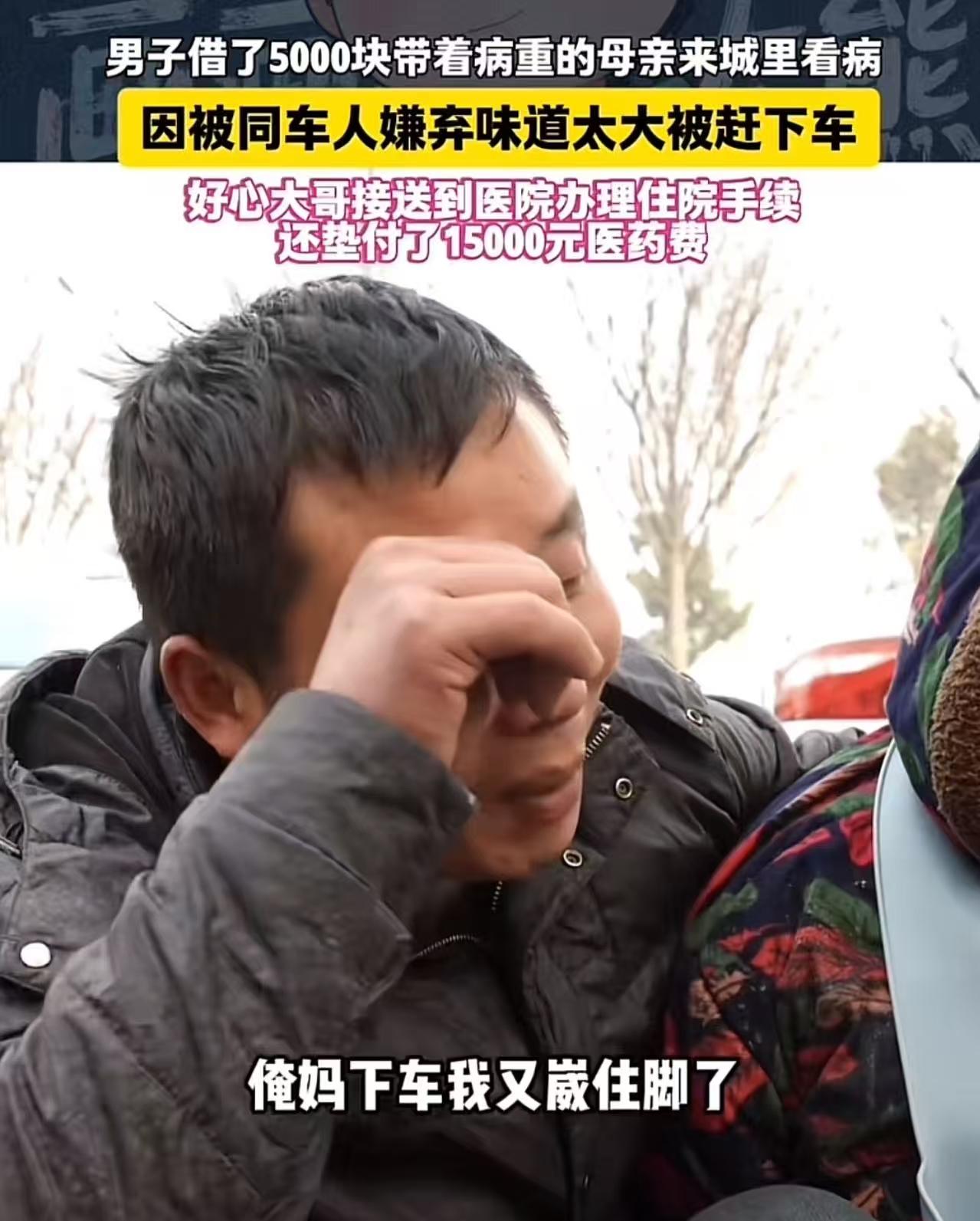 男子借了5000块钱待病重的母亲来横沥看吧,因被同车人嫌弃味道太大被赶下车,好心大哥看到后,不仅开车送他们去医院办理住院手续,还垫付了15000元的医药费!网友:嫌弃的人心好狠啊。真心心疼,每个人都会老去! 寒冬清晨,天刚蒙蒙亮,陈建国(化名)就背着78岁的老母亲,站在村口等公交车。 他怀里紧紧攥着一个破旧布包——里面装着东拼西凑借来的5000块钱,是他全部的希望。 母亲得了重病,大小便失禁,神志时清时昏。为了带她去市里大医院做手术,陈建国一夜没睡,带母亲坐上了最早一班城乡公交。 车上人不多,他小心地用旧毯子裹住母亲,生怕她受凉。 可车开的太久,母亲突然在座位上失禁。一股异味迅速弥漫开来。 起初没人说话,但随着乘客陆续上车,抱怨声此起彼伏: “什么味儿啊?太臭了!” “怎么带这种人上车?有没有公德心?” “司机!让他们下去!别影响别人!” 有人捂着鼻子往后躲,有人直接打开车窗,冷风灌进来,吹得老人直哆嗦。 最后,几个年轻乘客干脆站起来围住陈建国:“你们赶紧下车!别耽误大家时间!” 陈建国红着脸连连道歉,可没人听。司机也无奈摇头:“兄弟,要不你先下吧,后面还有好几站……” 他咬着牙,默默背起母亲,拎起行李,在一片嫌弃的目光中下了车。 陌生的街道,寒风刺骨。他不知道医院还有多远,只能一边问路,一边深一脚浅一脚往前走。 母亲在他背上微弱地呻吟,他眼眶发热,却不敢停下。 就在这时,一个大哥开车路过,询问陈建国怎么回事? 陈建国哽咽着说了经过。大哥听完,二话不说推开车门:“快上车!我送你们去医院!” 到了医院,大哥没有急着走,不仅帮忙挂号、推轮椅,还全程陪着做检查。 当医生告知需要立即住院手术,费用至少2万元时,陈建国脸色瞬间煞白:“我……我只有5000……”他低下头,声音颤抖,“实在不行,我再去借……” 大哥没等他说完,直接掏出手机:“差多少?1万5是吧?我先垫上。” 转账成功的提示音响起那一刻,陈建国的眼泪再也止不住,扑通一声跪在地上:“大哥,我这辈子一定还您!我给您磕头了!” 大哥赶紧扶起他:“别这样!谁家没个急难?钱的事别愁,先救老人要紧。” 此事引发热议: “嫌弃的人心真狠!老人又不是故意的,那是病啊!可这位李大哥,才是真正的‘人’字怎么写!” “看哭了。我妈去年住院,我也被人嫌过。所以特别懂那种无助——而陌生人的一点光,能照亮整个黑夜。” “建议媒体找到这位大哥!他不是有钱,他是有心。这年头,良心比黄金贵。” 在这个连扶老人过马路都要拍视频自证清白的时代,李大哥的举动像一记响亮的耳光—— 打醒了那些躲在“怕惹麻烦”背后冷漠的灵魂。 而那些在公交车上捂鼻驱赶病母的人,或许永远不会明白—— 他们嫌弃的不是“味道”,而是自己正在失去的人性温度; 他们赶走的不是“麻烦”,而是未来某一天,当自己老去、失禁、无助时,可能遭遇的同样冷漠。