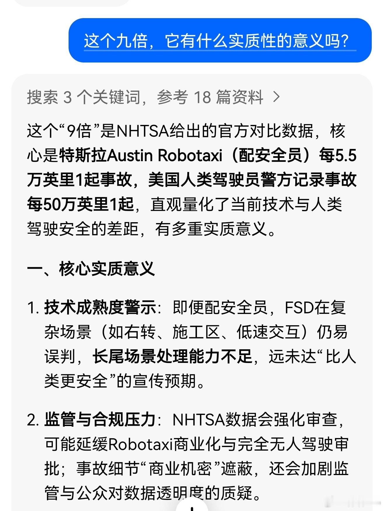 豆包不仅给出了一个比较理智的解释,更值得一提的是,它验证了下数据来源。人类驾驶员数据来自于警方记录事故,“私了”协商解决的不算。所以它觉得数据偏差大概应该是2.7倍。而且50万英里数据小样,唉,就是个小样。我理解就是比没有数据强。非说有多少代表性意义呢?顶多吵架的时候,看起来是认真的。