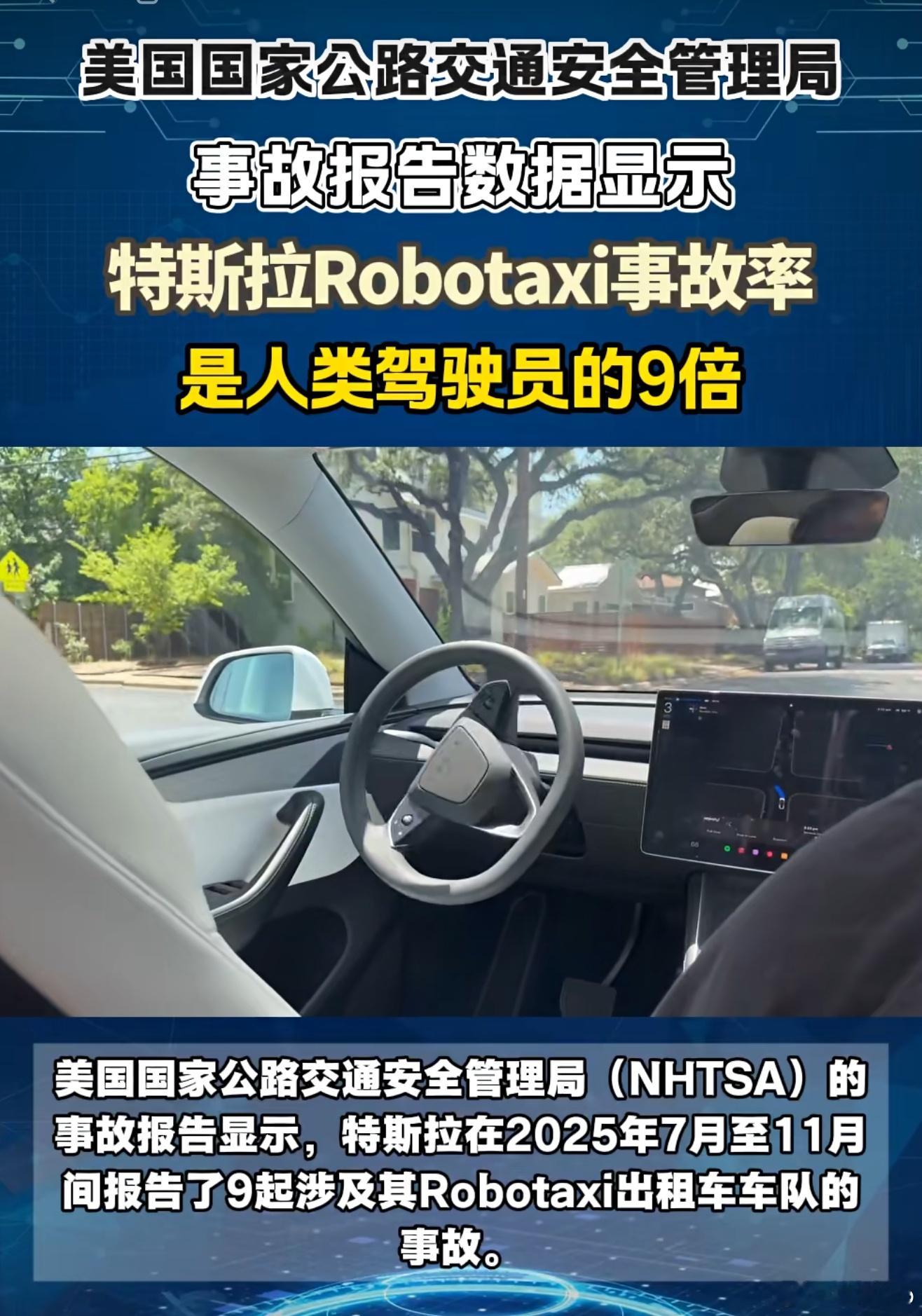 昨天看到一个新闻,而且好多人发:NHTSA(美国国家公路交通安全管理局)发布信息特斯拉Robotaxi的事故率是人类驾驶员的9倍。
