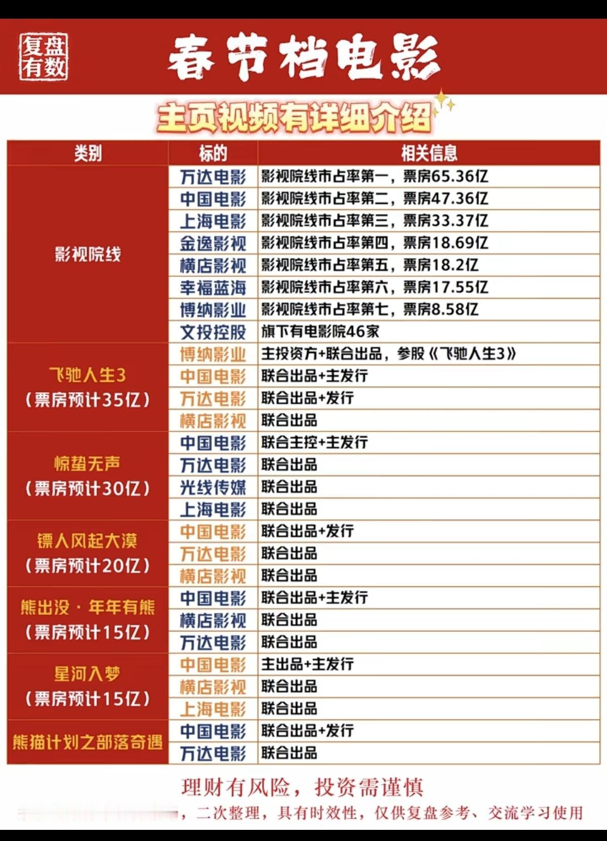 2026年春节档:电影! 相关投资收益龙头股整理: 春节期间关注影视及AI、机器人板块