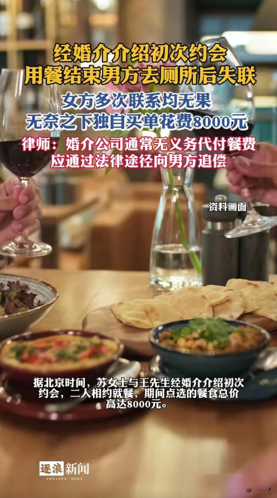 1月29日北京时间报道 苏女士和王先生由婚介所认识 初次约会吃饭点菜花费八千元 两个人吃的差不多了,男的以上厕所为借口就跑了,女的多次联系男的没联系上,只能含泪独自支付吃饭的费用 苏女士咨询律师想让婚介所承担部分费用,律师解读婚介所通常不会支付 这里没有说明是谁点的贵菜,大概率是女方点的,头一回见面吃饭,就把普通人俩月的工资给吃没了,相信无论哪个男的都不会接受,一看就是不是过日子的人,平常情侣俩人吃饭别说8千了, 5百就不少了,说的还是大城市,假如四五线城市,200块钱俩人就已经吃的很好了,这男的及时跑了,一点没毛病。