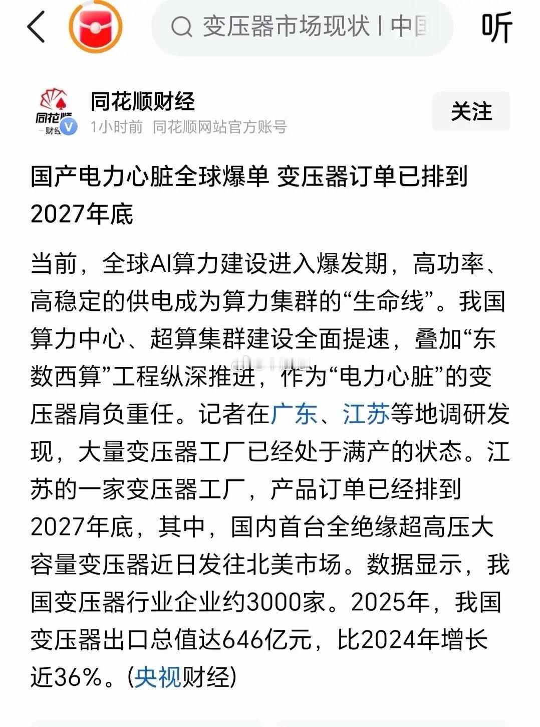 电网板块长期走牛是板上钉钉的事!核心逻辑硬到没话说,变压器赛道订单直接排到2027年底,供需缺口显著,龙头企业满产满销,内外需双轮驱动下景气度拉满。