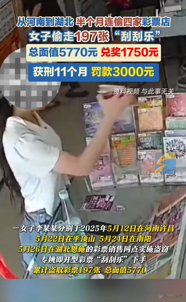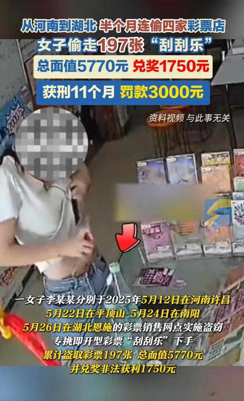 河南,一女子误以为发现了一条“生财之道”,专挑午后人少的彩票店,趁着店主短暂离开或忙碌的空档,迅速将柜台里一沓沓“刮刮乐”彩票揣进自己口袋。第一次在许昌某彩票店得手56张、面值2320元后,兑得450元现金。尝到了甜头后,女子前往平顶山另一家彩票店,盗走整整4包共120张彩票。一次次得手让她的胆子越来越大,她甚至跨省流窜,在南阳、湖北恩施的便利店和彩票站继续作案。短短半个月,女子四次盗窃,累计拿走197张彩票,总面值5770元,陆陆续续兑出了1750元奖金。案发后,女子因涉嫌盗窃罪被检察院提起公诉。法院这样判决。 据悉,2025年5月某天午后时分,有一家彩票店店主因事短暂离开,未锁的柜台里,有一沓沓色彩鲜艳的即开型彩票“刮刮乐”。 女子李某某走进了这家空无一人的店铺,她的目光没有在墙上的中奖号码表停留,而是迅速锁定了柜台内那些即开即兑的彩票。 在这短短几分钟内,她伸手拿走了56张总面值达2320元的“刮刮乐”,随后迅速离开。 几天后,这些被盗的彩票中的一部分被刮开,其中一些幸运地中了奖,李某某拿着它们在不同网点兑换了450元现金。 这笔不大不小的“横财”,点燃了她心中危险的贪婪之火,并就此拉开了一场跨越两省四地、持续半个月的连环盗窃序幕。 第一次得手的“顺利”,让李某某误以为找到了一条“生财捷径”。 5月22日,李某某的身影出现在平顶山另一家彩票店,同样的情节再次上演,她趁人不备,盗走整整4包共计120张、面值2400元的“刮刮乐”。 这一次的“收获”更为丰厚,兑奖金额达到了1050元。 5月24日,在南阳市一家兼营彩票的便利店,李某某“轻车熟路”地盗走11张面值550元的彩票,兑得100元。 此时的她,沉浸在一次次轻易得手的“成功”中,开始迈出了河南省。 5月26日,在湖北省恩施市的一家彩票店内,她第四次出手,盗走10张面值500元的彩票,兑奖150元。 短短半个月内,四地流窜,四次作案,累计盗取“刮刮乐”彩票197张,总面值5770元,通过兑奖非法获利1750元。 天网恢恢,疏而不漏。 李某某的行踪终究被遍布街头的监控探头记录,被盗彩票的序列号也成为了追踪的线索。 警方很快锁定了这位专偷“刮刮乐”的李某某,并将其抓获归案。 到案后,李某某对自己的犯罪事实供认不讳,并自愿签署了认罪认罚具结书,表示愿意接受法律的审判。 案件被移送到法院审理。 在庭审时,法院查明李某某是一个“累犯”。这说明其曾因犯罪被判处有期徒刑,且本次犯罪是在刑罚执行完毕后的五年之内。 法院会如何判决呢? 《刑法》第二百六十四条规定,盗窃公私财物,数额较大的,或者多次盗窃……处三年以下有期徒刑、拘役或者管制,并处或者单处罚金;…… 法院指出,李某某在2025年5月期间,四次趁彩票销售网点无人之际,秘密窃取即开型彩票197张,总面值5770元,并兑奖获利1750元,其行为符合盗窃罪的构成要件。 关键争议在于盗窃数额的计算,李某某方可能提出,李某某实际兑奖仅得1750元,犯罪危害较小,应以获利金额认定数额。 但根据《最高人民法院、最高人民检察院关于办理盗窃刑事案件适用法律若干问题的解释》第五条,盗窃数额应按被盗财物的实际价值计算。即开型彩票作为有价票证,其面值代表法定可兑付金额,体现了财产属性。 盗取彩票即侵占了票面所载的全部财产权益,无论是否兑奖、兑奖多少,均不影响对整体财产权的侵害。 法院认为,李某某盗窃数额为彩票总面值5770元,而不是实际兑付金额,其盗窃数额超出河南省标准为2000元以上,构成盗窃罪。 同时,《刑法》第六十五条规定,被判处有期徒刑以上刑罚的犯罪分子,刑罚执行完毕或者赦免以后,在五年以内再犯应当判处有期徒刑以上刑罚之罪的,是累犯,应当从重处罚…… 法院进一步指出,证据显示,其此前因犯罪被判处有期徒刑,刑罚执行完毕未满五年又犯本罪,完全符合累犯的规定。 法院认为,李某某在短时期内连续跨地作案,主观恶性较深,社会危害性较大,依法应从重处罚。 不过,《刑事诉讼法》第十五条规定,犯罪嫌疑人、被告人自愿如实供述自己的罪行,承认指控的犯罪事实,愿意接受处罚的,可以依法从宽处理。 法院认为,虽累犯应从重,但李某某到案后如实供述罪行,自愿签署认罪认罚具结书,此情节依法可从宽处理,二者并行不悖。 最终,法院判处李某某有期徒刑十一个月,并处罚金3000元,责令退赔经济损失、追缴违法所得。 这份判决,量刑适当,既惩处犯罪,又弥补对受害人的侵害。 对此,您怎么看?