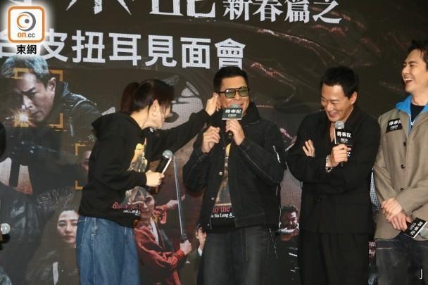 提到古天樂媽媽早前生日,他更在合照展露笑容,宣萱聞言即搶答:「佢生日先木口木面啫,Auntie生日唔會嘅,我見佢笑得幾開心,啊對唔住我又代答咗添」,令古天樂不禁揶揄她:「我阿媽生日你都答埋,喂點啊」,宣萱即忍不住出龍爪手襲向古天樂,引起一旁粉絲的歡呼聲,場面搞笑。至於提到他有份主演的電影《送院途中》被金像獎DQ,他表示有留意,但直言「無回應」。