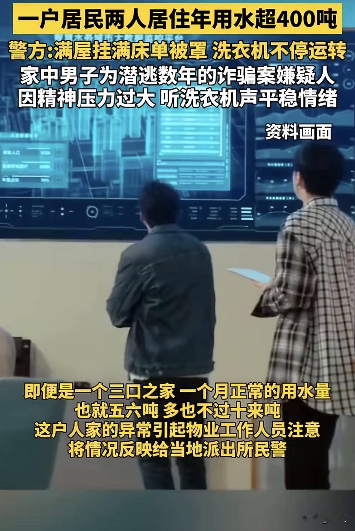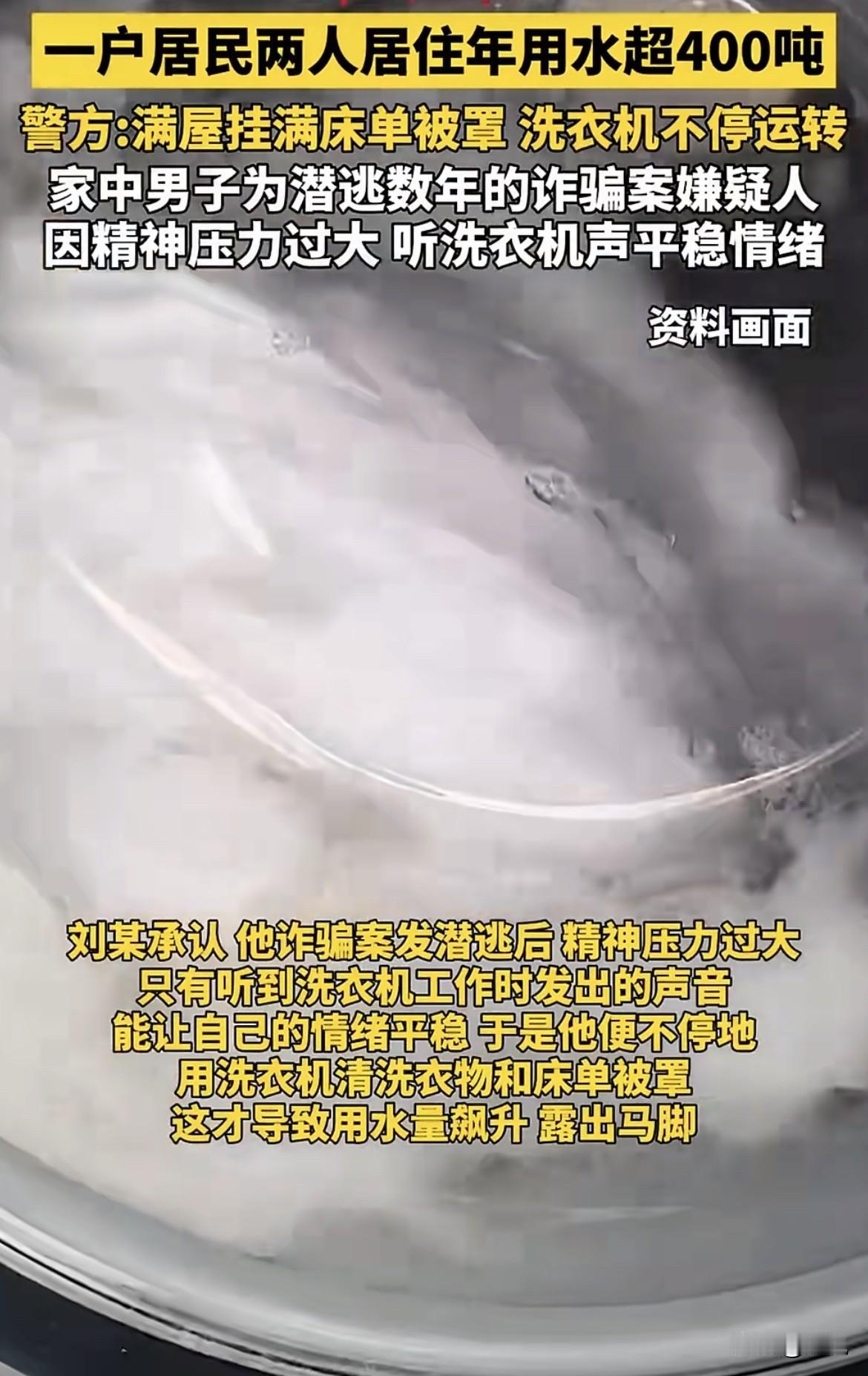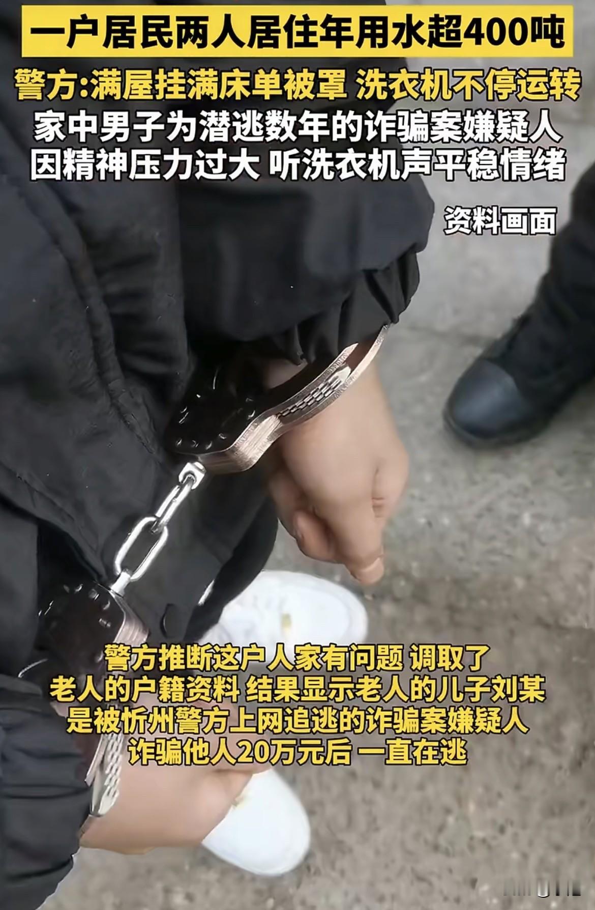山西太原一个小区里,物业年底对账,瞅见这数字直接懵了。普通人家三口人,一个月也就用个五六吨,十来吨顶天了。这家就一老太太和她“女儿”,咋能造出这么多水?400吨,物业心里直打鼓,转头就把这蹊跷事告诉了来片区走访的兴华派出所副所长张伟。 警察一听,警觉了。物业说,他们之前疑心是水管漏了,好几回派水暖工想进门查,可屋里那位老太太,回回都把人堵在外头,死活不让进。更怪的是,有次水暖工明明瞅见屋里有个儿子,可这户登记的根本没这号人。 老人为啥拼命掩饰?登记信息为啥对不上?张伟觉得,这里头肯定有事。 调监控,走访。线索一点点拼起来。老太太那个儿子,活得像个影子。早出晚归,没固定工作,从不跟邻居打交道,连个联系电话都没留过。唯有几个物业的人对他有点印象,因为他打扮太扎眼:不管天冷天热,总用帽子口罩把脸捂得严严实实,可骑的却是一辆特别显眼的粉红色自行车。 一个拼命隐藏面容的人,却骑着一辆无法隐藏颜色的车,这种矛盾本身就像个黑色幽默。 行踪诡秘,遮掩面目,加上老人反常的抗拒,张伟心里基本有谱了。一查户籍关联信息,果然,老太太的儿子刘某,是个在逃人员,几年前因为以为人安排工作为幌子,诈骗了别人20万,之后就一直潜逃。 人确定了,可那个巨大的问号还在:400多吨水,他到底用在哪儿了?难道除了诈骗,还有别的隐情?这用水量成了压在所有人心头的一块石头。 为了稳妥,张伟没敢直接动手。他们蹲守、观察,摸清了刘某的回家规律。抓捕那天,警方用了个巧法子。正好那阵子小区在催住户清理楼道杂物,警察就让物业和社区工作人员从一楼开始,挨家挨户大声敲门检查。 咚咚的敲门声在楼道里回响,既是通知,也是麻痹刘某的烟雾弹。等到工作人员敲过刘家的门,确认刘某在家且毫无防备后,真正的行动才开始。几分钟后,张伟再次上前,对着门喊:“你家门口的纸箱子咋还不清理?” 门,应声开了。警察冲进去,瞬间控制了还穿着秋衣秋裤的刘某。而当他们看清屋内的景象时,所有人都愣了一下。 那已经不像个正常的家了。屋里到处挂满了、铺满了刚洗好的床单、被罩和衣物。衣架根本不够用,很多就直接摊在床上、椅子上。而卫生间里,那台洗衣机还在轰隆隆地运转着,仿佛永远不知道疲倦。 面对审讯,刘某交代了。他说,自从犯了事逃出来,每天都活在恐惧里。不敢用手机,不敢找正经工作,只能去小饭馆打零工。巨大的精神压力让他晚上失眠,白天恍惚。后来他发现,洗衣机运转时那种持续、单调的轰鸣声,居然能让他紧绷的神经稍微放松下来,甚至能帮助他睡着。 于是,洗衣机就成了他廉价的“镇静剂”。只要在家,他就忍不住一遍又一遍地清洗那些衣物床单。有些东西还没晾干,就又被他扔回洗衣机,开始了新一轮的旋转。这个寻求片刻安宁的机械性重复动作,在自来水表上疯狂跳动,最终汇成了一个将他暴露的巨大数字——400吨。 一个想用水流声掩盖内心恐慌的人,没想到是水费单先出卖了他。那辆醒目的粉色自行车,或许是他潜逃生涯里,最后一点对“正常生活”笨拙而矛盾的向往。但终究,洗衣机转不走罪责,水流也冲不净过去。 这事儿你怎么看?你觉得他开着洗衣机的时候,到底是想忘记过去,还是在等待结局?