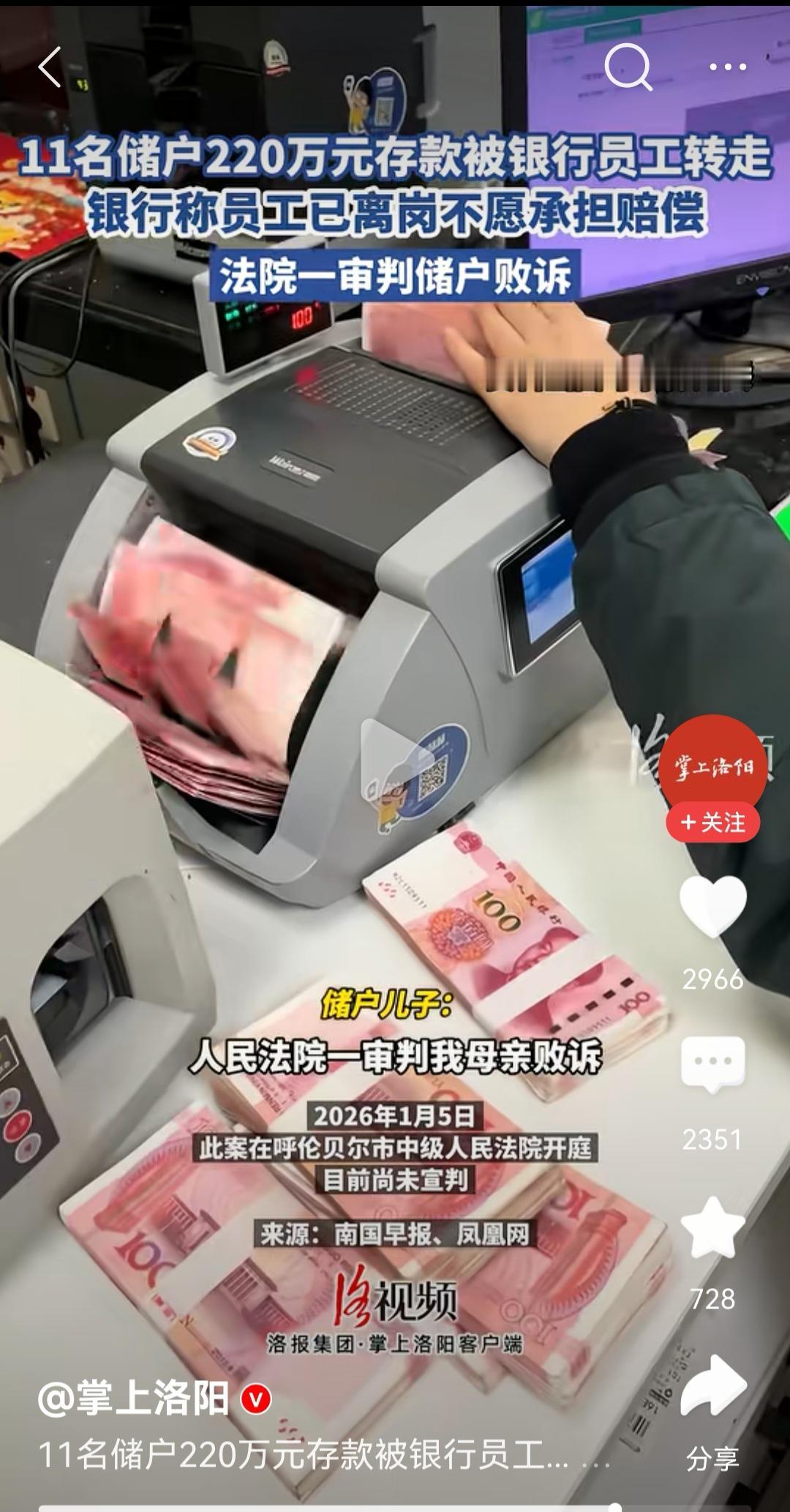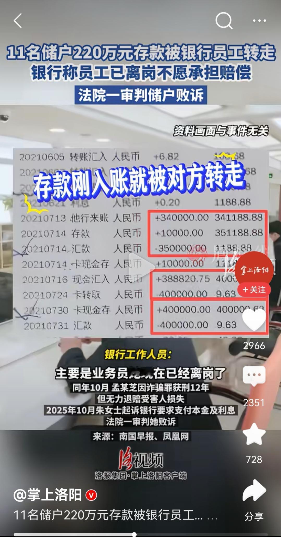 存款失踪背后,谁之过?银行应不应该担责?这应当取决于案件事实的进一步查明,我们不妨等子弹再飞一会儿。 近日,一则11名储户220万存款被银行员工转走,一审法院判决银行不担责的新闻,再次将存款安全这一话题推向舆论风口。一时间,对储户的同情与对银行的指责之声不绝于耳。然而,抛开情绪化的宣泄,我们应当注意现在新闻中并未对案件的整体情况进行披露,如果我们仔细分析一下,或许可以看到事情的另一面。 其实网上搜索一下,我们可以发现这类报道已经屡见不鲜,每一起类似事件几乎都开始于一个高回报的诉求。涉事银行员工也正是利用人性中对高回报的渴望,才得以将储户存款挪作他用,然而一旦挪用的资金存在安全问题后,就会出现涉事员工进入监狱,储户承受巨大损失的情况。新闻中那被转走的220万元,其背后也很可能存在类似状况。 如果你注意看一下新闻图片会发现,储户开始存储的时间是 2021 年,至今已经近五年,难道五年之内就没有发现自己的大额存款被转出去了吗?从款项流水看储户从 2021 年 7 月 14 日 开始陆续存入 35 万元,该存款于 7 月 24 日转出,之后又于 2021 年 7 月 30 日存入 40 万元,于 7 月 31 日转出。 难道储户对自己大额存款被转出就没有收到任何信息通知吗?即便没有收到任何通知。在 2021 年 7 月 30 日再次存款的时候总不能不知道自己的银行卡余额吧。所以作为储户来说,希望利用舆论压力帮助自己争取权益可以理解,但是还应当给予舆论真实的案件情况,否则一旦舆论反转时,反而更加受到舆论的反噬。 其实法律对此亦有清晰的界定。《民法典》明确规定,民事主体从事民事活动,应当遵循诚信原则。客户若为获取高回报,主动配合银行员工,将款项直接转入员工或个人指定的账户,或者交出密码和身份证件等,其行为本身便构成了重大过错。这不仅严重违背了与银行之间储蓄合同的审慎注意义务,也在客观上为犯罪行为提供了便利。 所以相信一审法院在审理时,势必会考量这一过错对损害后果的原因力。因此,如果你幻想我弱我有理,试图将自身贪利所致的全部风险转嫁给机构,既于法无据,也非公平之举。 当然 银行是否应该担责,我们尚待二审法院的终审判决结果。但这件事给我们每个人带来的教训必须要有清晰的认识: 一是,舆论基于同情心与道德感的朴素判断,难以替代现代司法基于证据链和法律逻辑推理带来的理性判断。 二是,银行应当加强内部管理,否则无论法院判决你最终是否担责,一旦公众对你的信任崩塌,损失是难以预计的。 三是,警示我们每一个储户,不要幻想占便宜、天上掉馅饼的好事儿。遏制自己的贪念才是自己存款安全的最大保障,也才能从根本上堵住类似事件的发生。