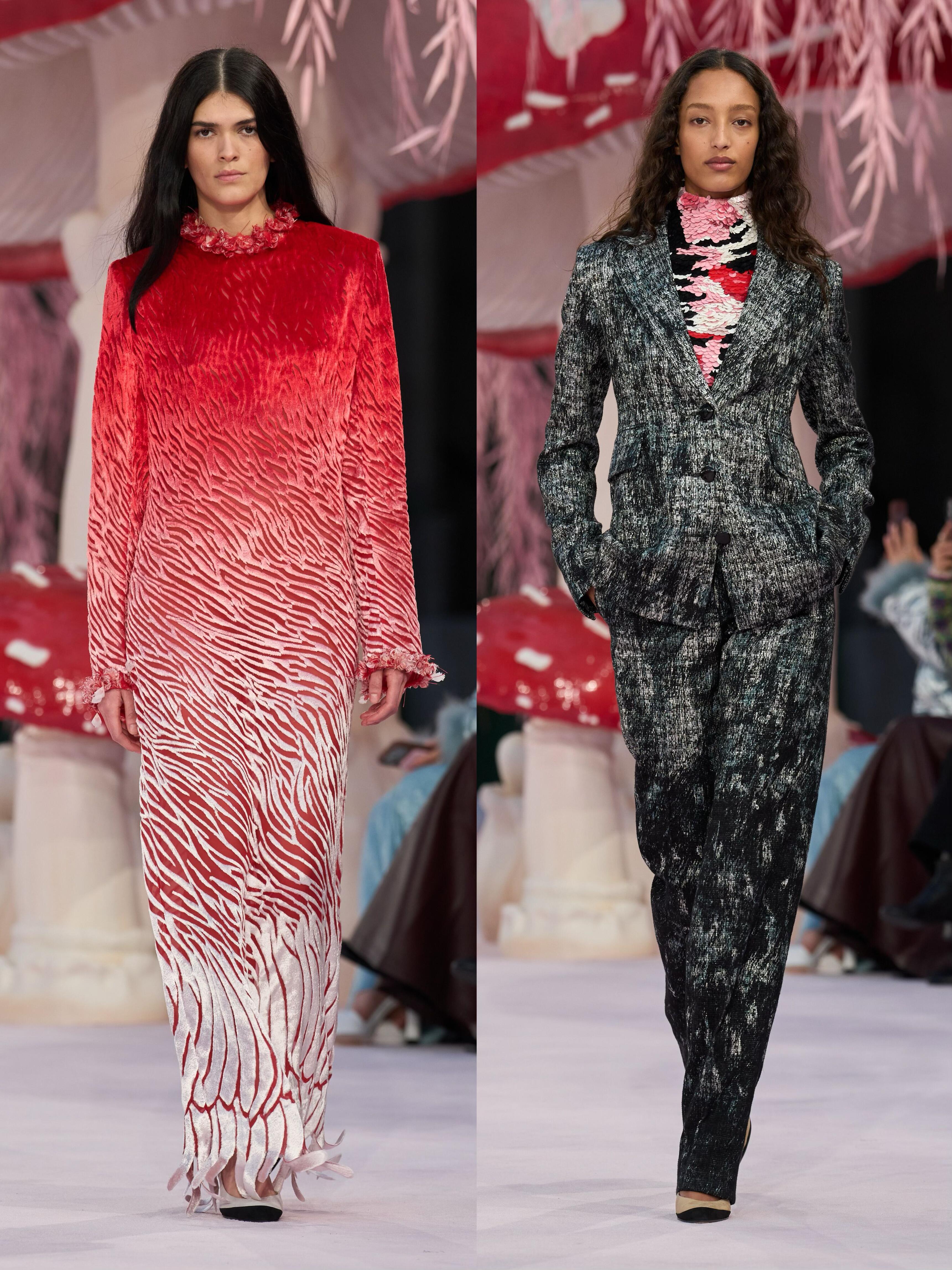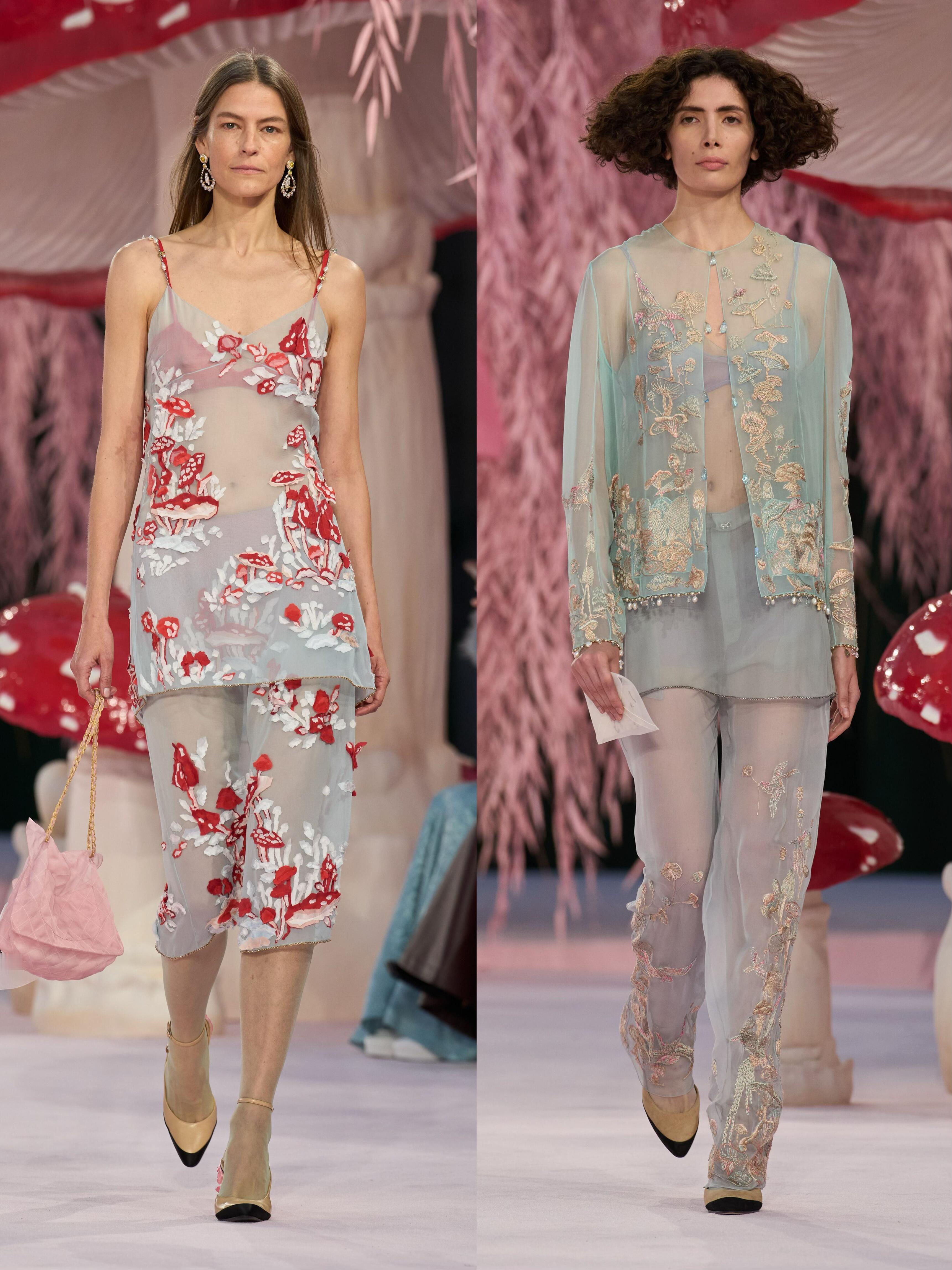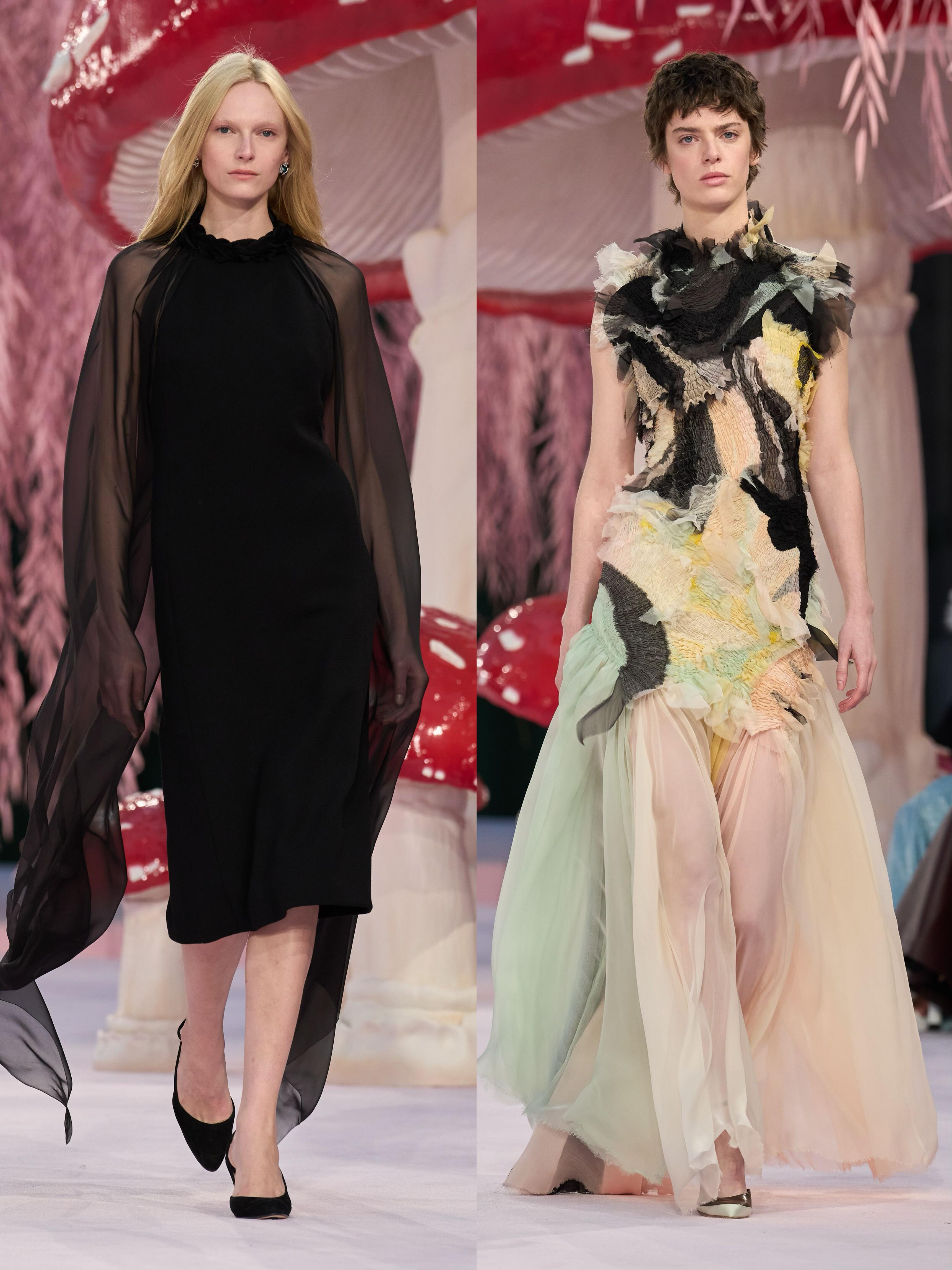 Matthieu Blazy接棒香奈儿后的首场高定大秀,直接把秀场变成了“奇幻蘑菇森林”。粉色的树、满地的蘑菇装置,配上薄如蝉翼的彩色纱裙、斜纹软呢套装和轻盈羽毛,像极了吃菌子后看到的梦幻画面。蘑菇刺绣、山茶花装饰和渐变色彩贯穿全场,毛边设计和岩石纹理细节让高级感拉满。从少女到奶奶辈的模特一起走秀,打破了年龄界限,把“梦幻森林”的浪漫和生命力传递给了每个人。