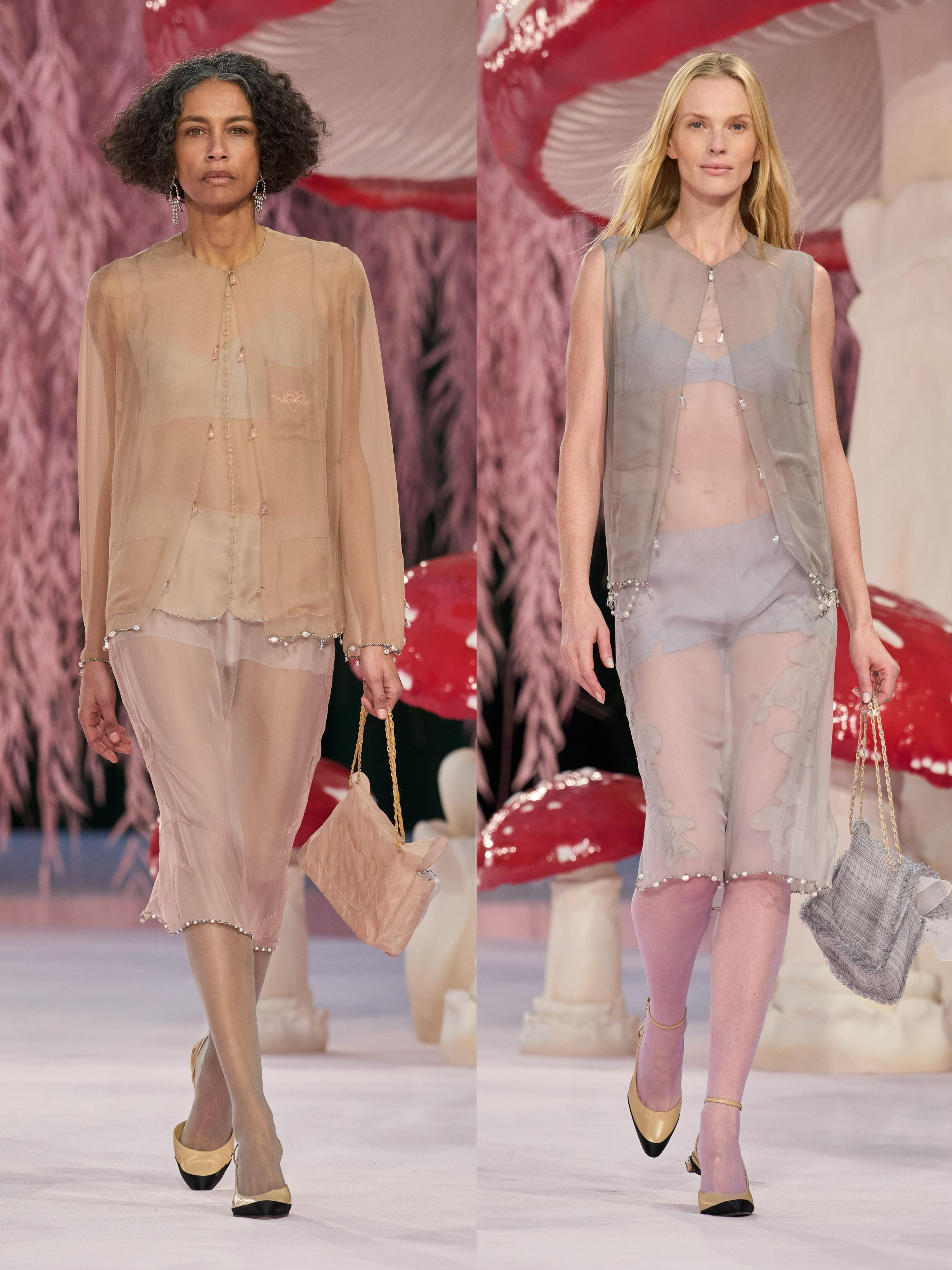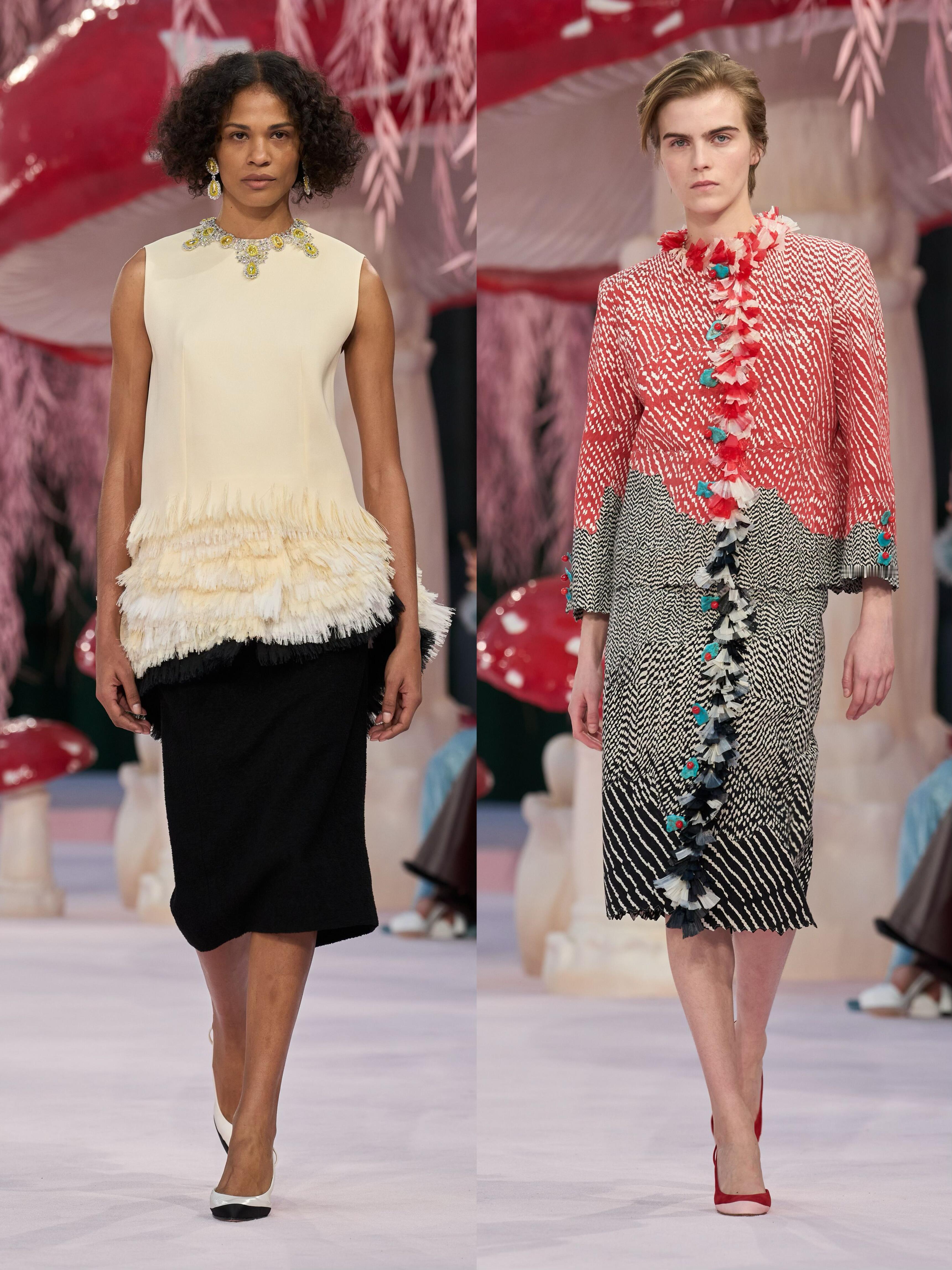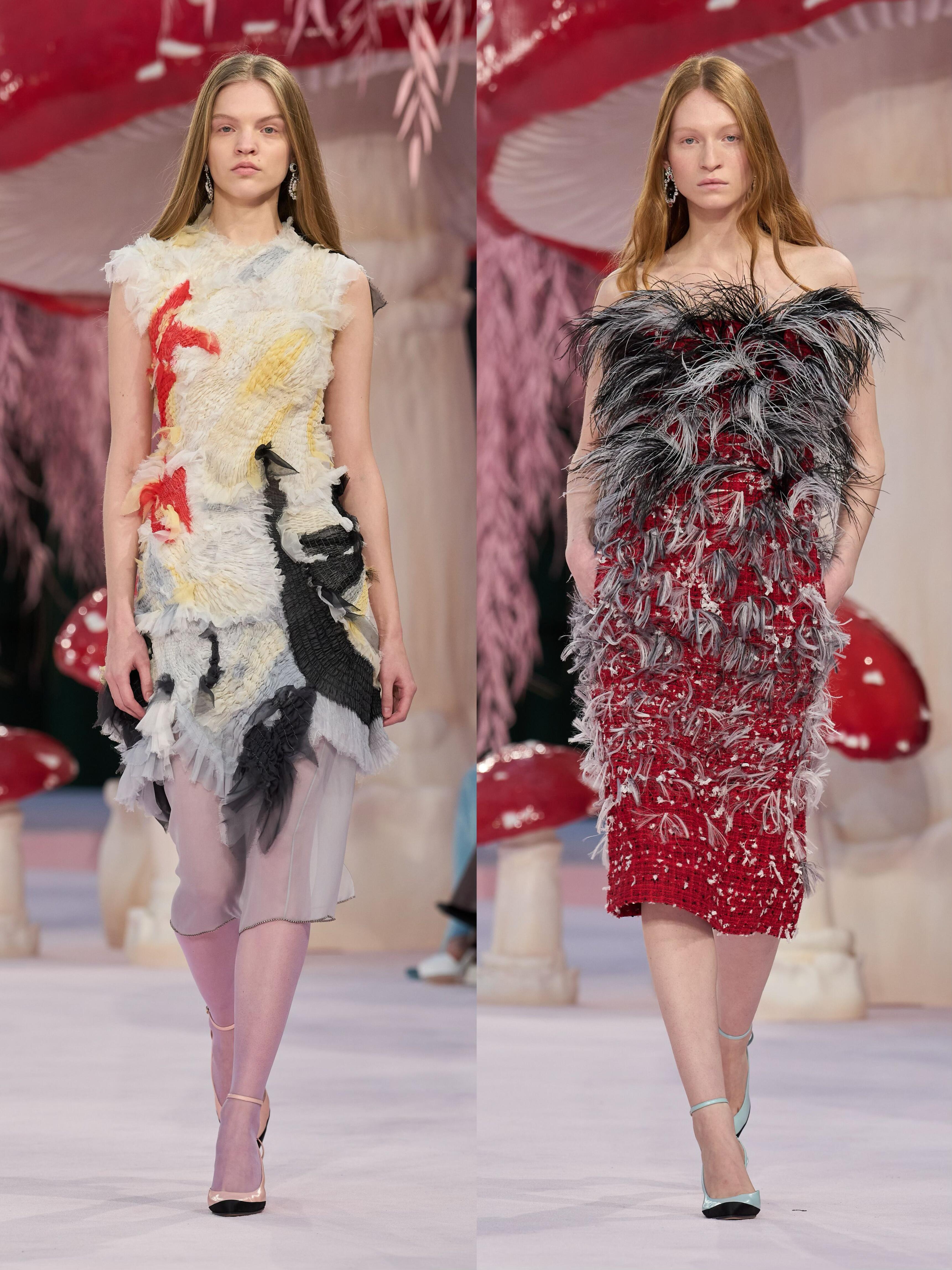 Matthieu Blazy接棒香奈儿后的首场高定大秀,直接把秀场变成了“奇幻蘑菇森林”。粉色的树、满地的蘑菇装置,配上薄如蝉翼的彩色纱裙、斜纹软呢套装和轻盈羽毛,像极了吃菌子后看到的梦幻画面。蘑菇刺绣、山茶花装饰和渐变色彩贯穿全场,毛边设计和岩石纹理细节让高级感拉满。从少女到奶奶辈的模特一起走秀,打破了年龄界限,把“梦幻森林”的浪漫和生命力传递给了每个人。