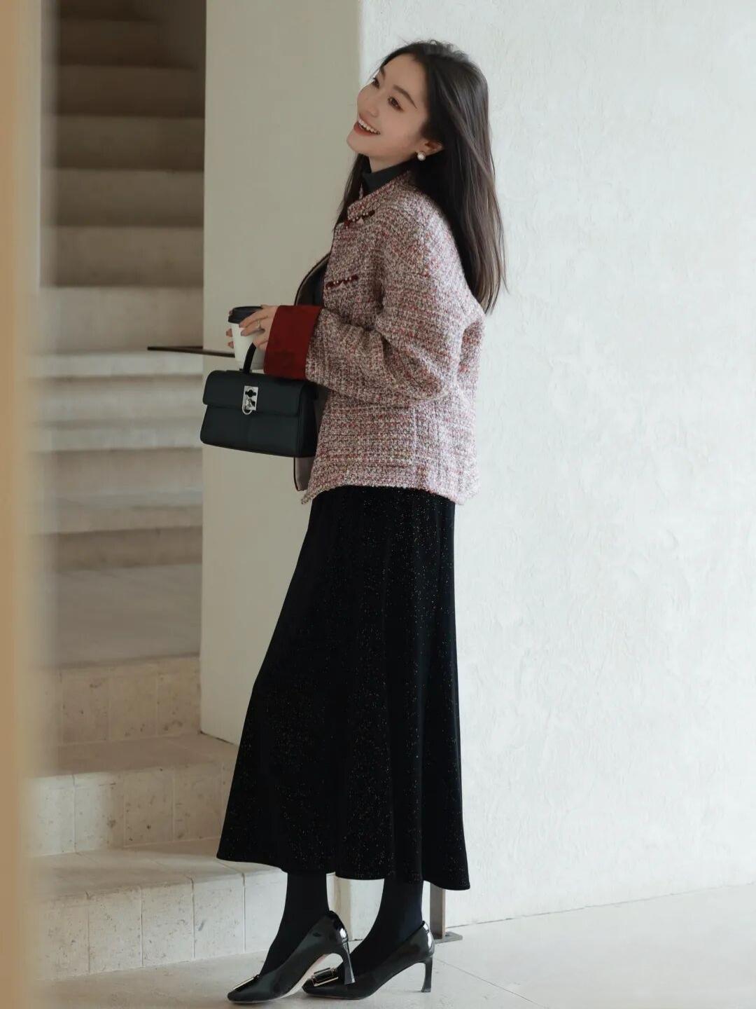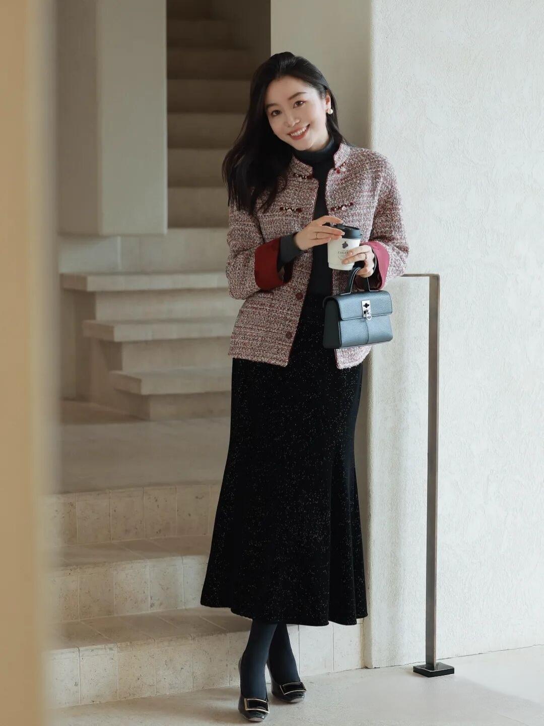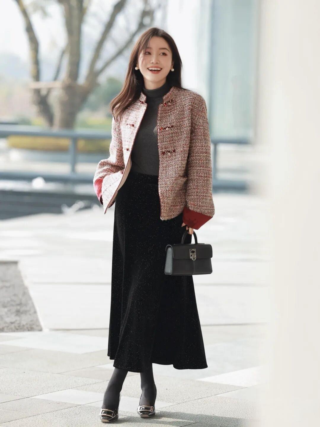 这套穿搭是华丽感的红黑风,把节日氛围与轻奢质感融合。黑色毛绒外套自带华丽气场,内