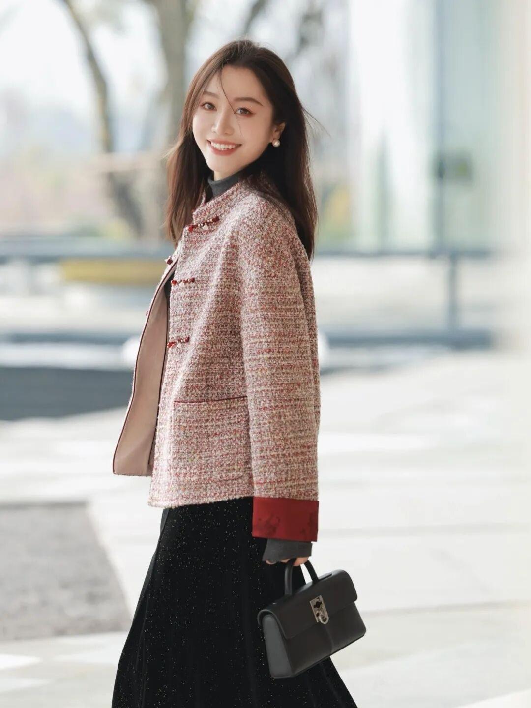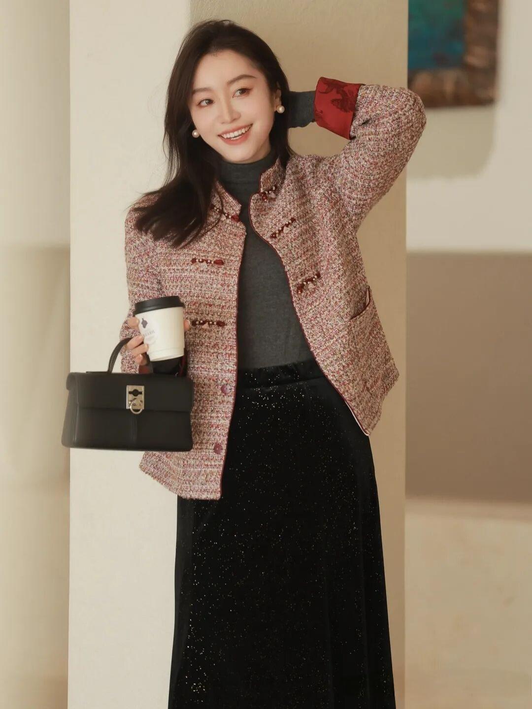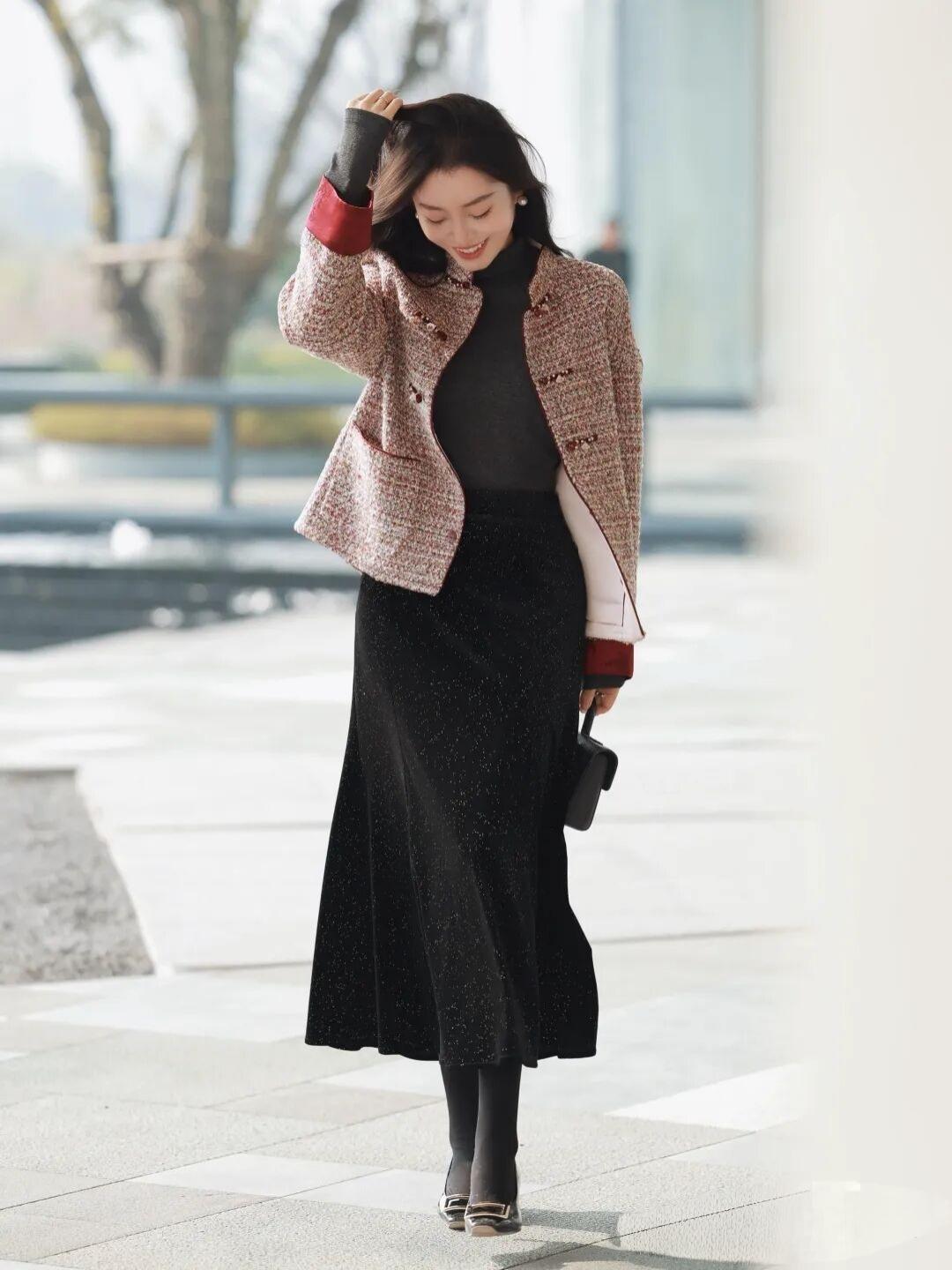 这套穿搭是华丽感的红黑风,把节日氛围与轻奢质感融合。黑色毛绒外套自带华丽气场,内