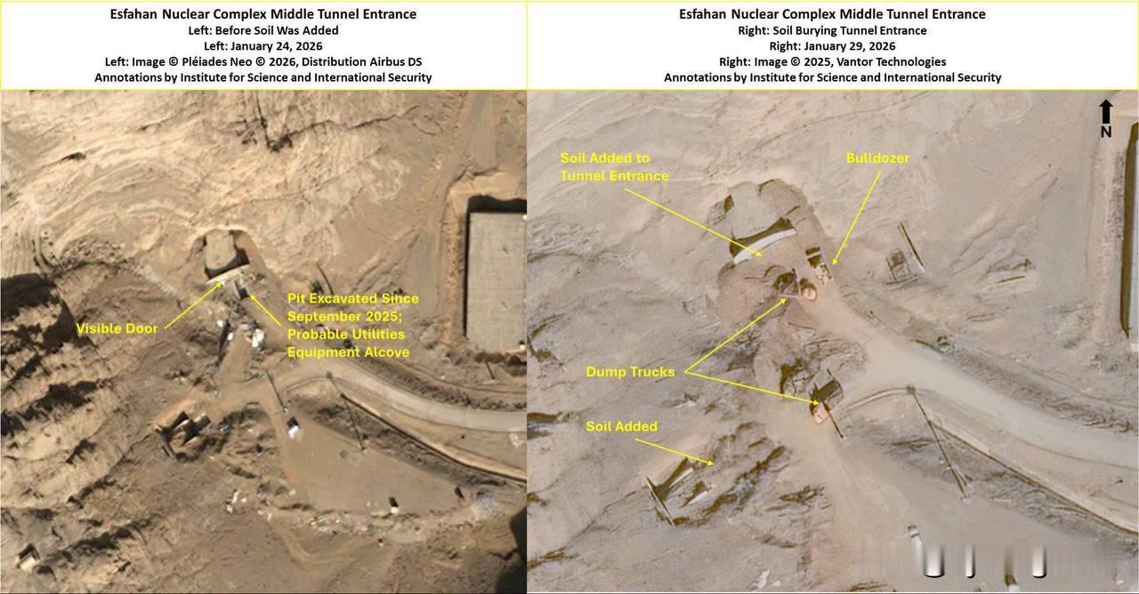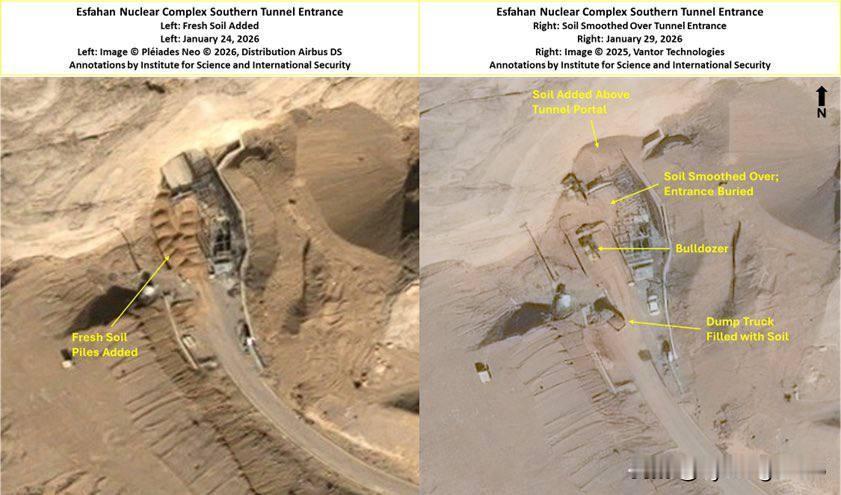 🇮🇷伊朗伊斯法罕核设施的卫星图像显示,该设施出现了新的活动。据科学与国际安全研究所称,德黑兰方面已重新填埋了地下设施的中央入口,并在南侧入口处铺设了一层新土。此举旨在为储存约408公斤高浓缩铀的设施提供额外保护,使其免受潜在的空袭。 此前,这些入口曾因工程作业而临时开放:隧道已用超高强度混凝土加固,这表明伊朗已从“隐蔽储存”转向长期防御工事化。换言之,该设施并非只是被封存,而是在为应对持续的军事威胁做好准备。 此前用于生产离心机的地上建筑的活动尤其令人担忧。西方分析人士估计,伊朗可能正在采取措施,恢复将铀浓缩至武器级(90%或更高)水平。 关键在于深度。伊斯法罕的地下隧道深达100多米,据称在2025年6月的“午夜铁锤行动”中并未遭到打击。人们认为,即使是美国军火库中最强大的钻地弹——GBU-57 MOP,也无法保证摧毁此类目标。 在此背景下,另一个因素浮出水面:一座新的地下核设施正在建设中,西方称之为“镐山”。关于该设施的信息极其匮乏,但间接证据表明,其深度和规模均超过了福尔多核设施,并且可能已经配备了离心机。