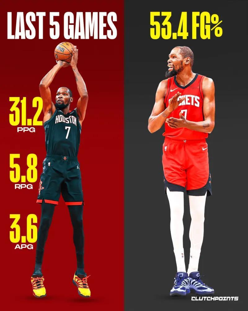 死神模式!杜兰特过去5场比赛: 对阵76人,36分7篮板3助攻 对阵活塞,32分7篮板3助攻 对阵灰熊,33分8篮板2助攻 对阵马刺,24分2篮板6助攻 对阵老鹰,31分5篮板4助攻 场均31.2 分5.8 个篮板3.6 次助攻 投篮命中率 53.4% 三分命中率 47.5% 罚球命中率 87.1% 真实命中率 62.6% 更重要的是,杜兰特的得分,大部分都是中远距离投篮,过半场无死角的得分能力,在37岁的年纪,能有这样的状态,且能持续的发挥,真的太难了。 唯一的隐患就是主教练乌度卡,他现在就是靠着杜兰特的进攻在维持火箭的战绩,这5场比赛,杜兰特出场时间干到了38.4分钟,同时间段全联盟第二多。 而本赛季至今,杜兰特的场均出场时间也达到了36.8分钟,仅次于马克西和阿门,位列联盟第3。 但那哥俩,一个25岁,一个23岁。杜兰特,37岁....