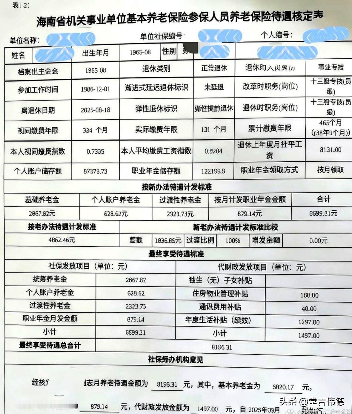 5000多点退休工资很高吗? 这份退休待遇核算表,生动展现了机关事业单位养老保险制度改革后,“中人”(改革前参加工作、改革后退休的人员)养老金的计算方式与最终构成。 退休人员1965年8月出生,2025年8月退休,工龄累计38年9个月,属于“正常退休”中的“弹性提前退休”。其养老金计算采取“新老办法对比、保低限高”的原则:老办法待遇为4862.46元,新办法计算出的待遇(含职业年金)为6699.31元,新办法高出老办法1836.85元。根据规定,对于改革后若干年内的“中人”,这部分差额按一定比例发放,此处过渡比例为100%,故最终完全按新办法执行。 解析其8196.31元的月待遇总额,它由三大块构成: 1. 社保基金发放部分(6699.31元):这是主体,包含: · 基础养老金(2667.82元):体现社会统筹和长期缴费的贡献。 · 个人账户养老金(628.62元):来自其个人账户储存额87378.73元的积累。 · 过渡性养老金(2923.73元):关键部分,用于补偿改革前漫长的“视同缴费年限”(334个月)的权益,其金额较高是“中人”待遇的重要特点。 · 职业年金(879.14元):改革后建立的补充养老保险,按月领取,是其待遇提升的重要因素。 2. 财政代发补贴部分(1497.00元):包括住房物业、通讯补贴及年度生活补贴等,保留了事业单位福利的延续性。 结论: 虽然总额未过万,但近8200元的退休金在多数地区能提供一份体面、安稳的晚年生活。这份待遇清晰地体现了“多缴多得、长缴多得”与“改革前后待遇平稳衔接”的原则。其构成中,过渡性养老金与职业年金显著提升了替代率,确保了“中人”在制度转型中的利益。可以说,这位退休人员拿到了一份充分反映其工作年限、职称与制度保障的、结构合理的结果。